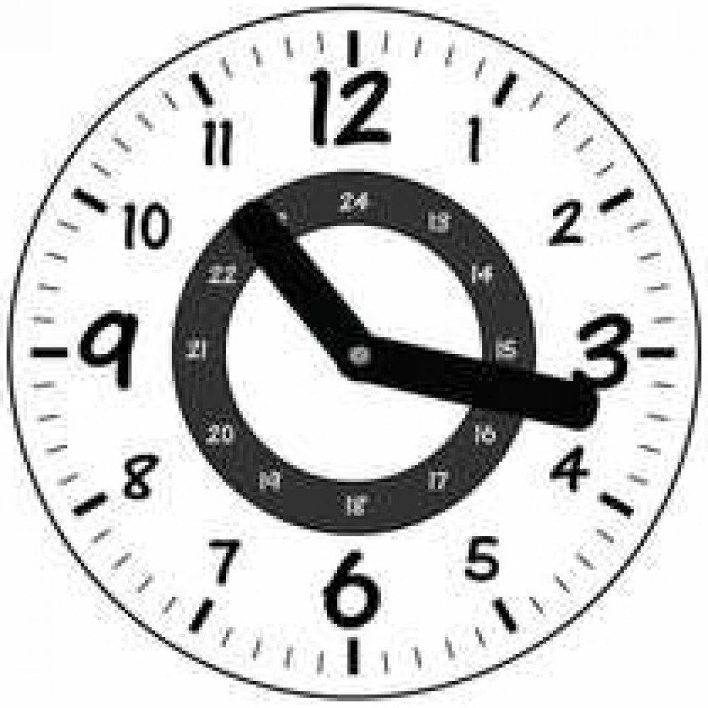 Papírové hodiny z pevné lepenky, potažené laminem s plastovými rafikami, ukazující nastavený čas.