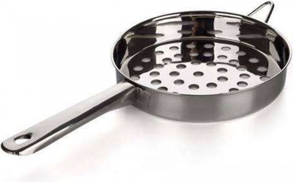 Cedník na halušky, k výrobě noků, játrové a jiné zavářky do polévek. Materiál: kvalitní nerez. Rozměry: průměr 18 cm, výška 3,5 cm, délka držadla 16 cm, velikost otvorů pr. cca 1 cm.