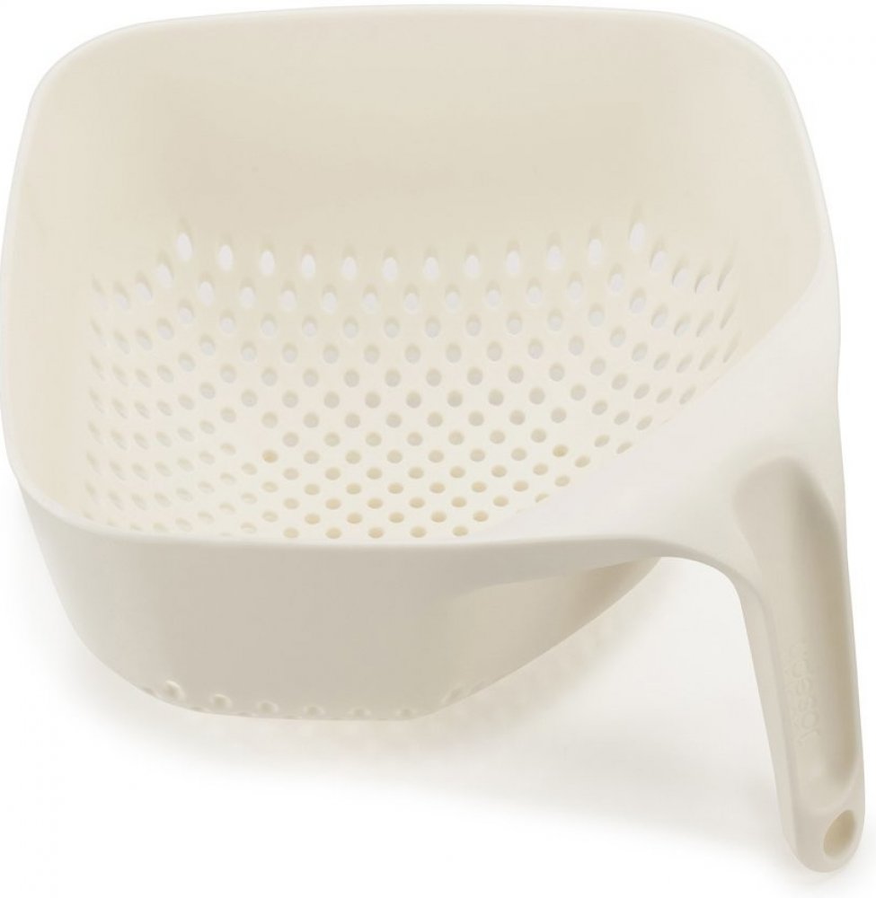 Velké protiskluzné vertikální madlo cedníku JOSEPH JOSEPH Square Colander zajišťuje při proplachování snadné a stabilní držení - druhá ruka zůstává volná pro manipulaci s kohoutkem. Kubické rohy umožňují snadnější vyjmutí opláchnutých potravin, velkými vertikálními otvory snadno a rychle odtéká voda.