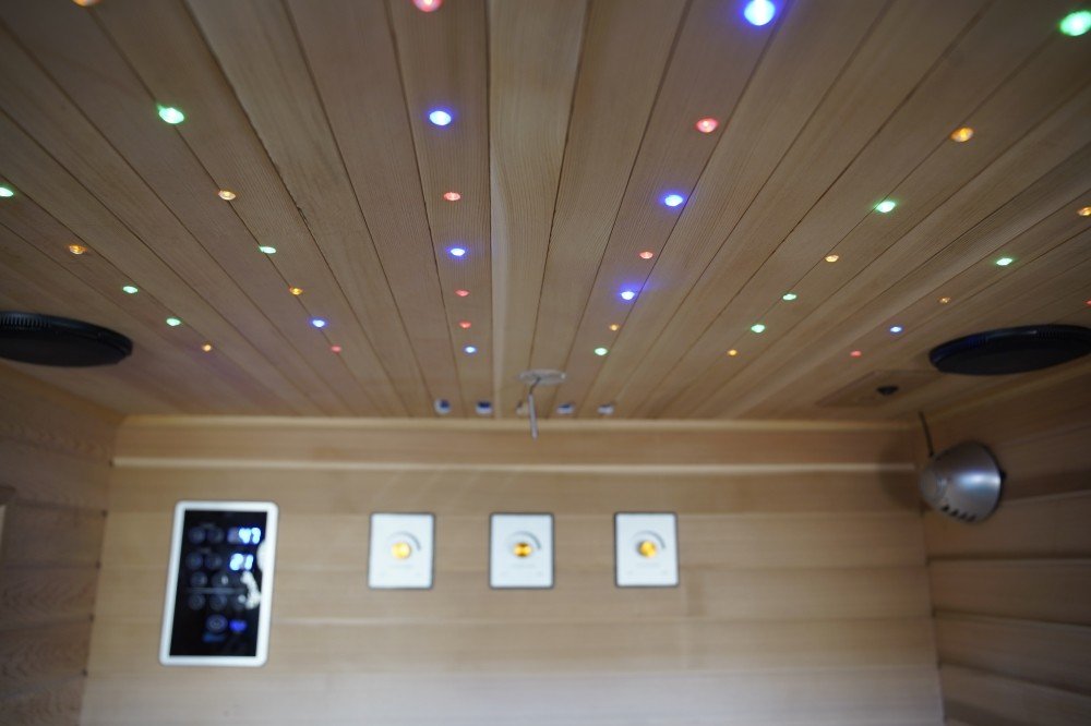 Pro ještě hlubší pocit uvolnění, klidu a relaxce je součástí této infrasauny světelná LED terapie v provedení "HVĚZDNÉ NEBE". Řada drobných LED diod umístěných po celém stropu infrasauny působí uklidňujícím dojmem, stejně jako byste byli pod hvězdnou oblohou.