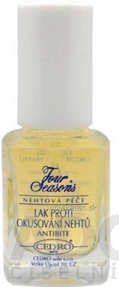 Při problémech s kousáním nehtů je lak proti kousání nehtů FOUR SEASONS® s extraktem pomerančové kůry. Tento přípravek odrazuje od kousání nehtů a nehtové kůžičky, upozorňuje svou hořkostí na začátku kousání a tím posiluje vůli zbavit se tohoto zlozvyku. Má dlouhotrvající účinky, posiluje strukturu nehtů a zajišťuje jejich normální růst.