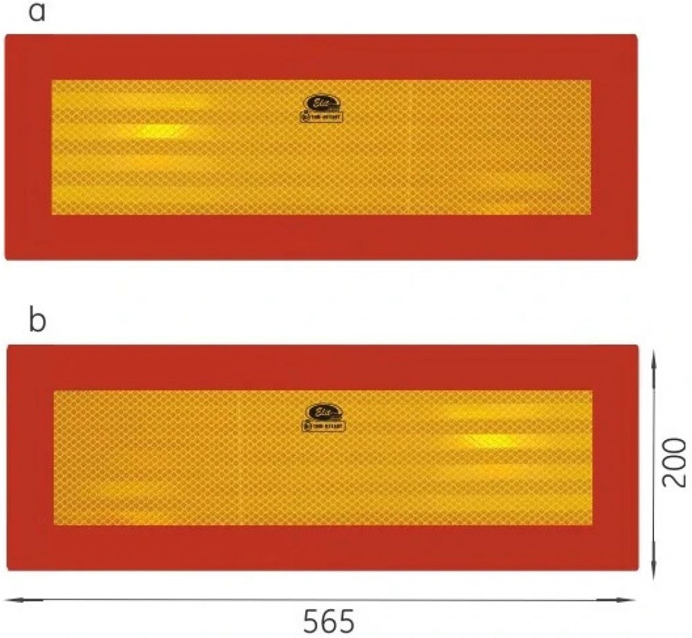 Sada dvou reflexních samolepek určených jako označovací štítky pro nákladní auta, kamiony, přívěsy a jiná dlouhá vozidla.