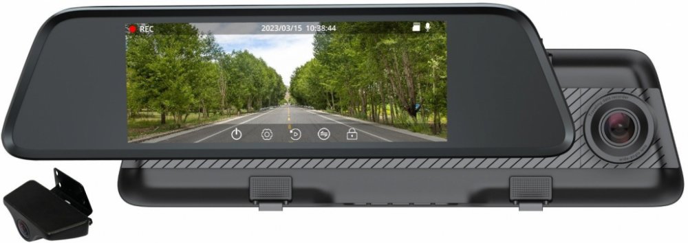 Duální kamera do auta vestavěná v přídavném zpětném zrcátku s 4,39" dotykovým displejem. Disponuje přední 2K kamerou, umístěnou v zrcátku, s úhlem záběru 128°. Zadní kamera nabízí Full HD rozlišení a úhel záběru 128°. Samozřejmostí je vodotěsné krytí IP67 pro bezproblémové použití na venkovní části vozidla. Zadní kamera kromě zaznamenávání dění za vozidlem během jízdy nalezne využití také jako couvací asistent. Vestavěný G-senzor má na starost, v případě prudkého pohybu, například nárazu, uzamknout na paměťové kartě záznam proti přepsání. Natočený obsah se ukládá na paměťové karty typu microSD do velikosti až 128 GB. Mezi další výhody kamery patří možnost připojení GPS modulu (není součást balení), díky kterému se do záznamu ukládají informace o poloze a rychlosti.