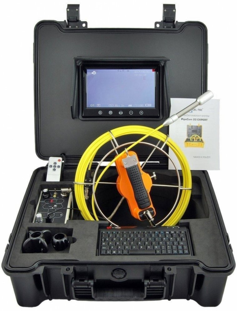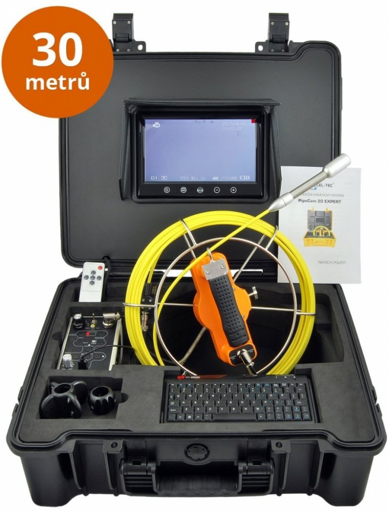 Inspekční kamera PipeCam 30 Expert s 30m kabelem, zobrazovací jednotkou, měřičem vzdálenosti a klávesnicí je zařízení určené pro inspekci kanalizací, odpadů, drenáží, studen, komínů atd. Zobrazovací jednotka 9“ je umístěna v horním víku. 30m kabel je obalený skelným vláknem (pružný, pevný). Kabel i kamera jsou vodotěsné. Záznam je barevný, rozlišení 720 x 576 pixelů.