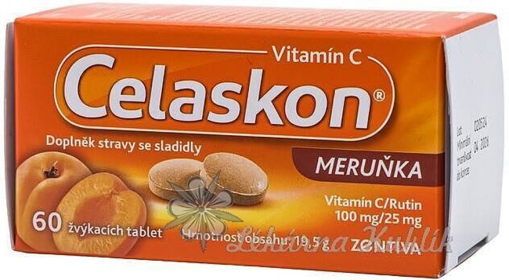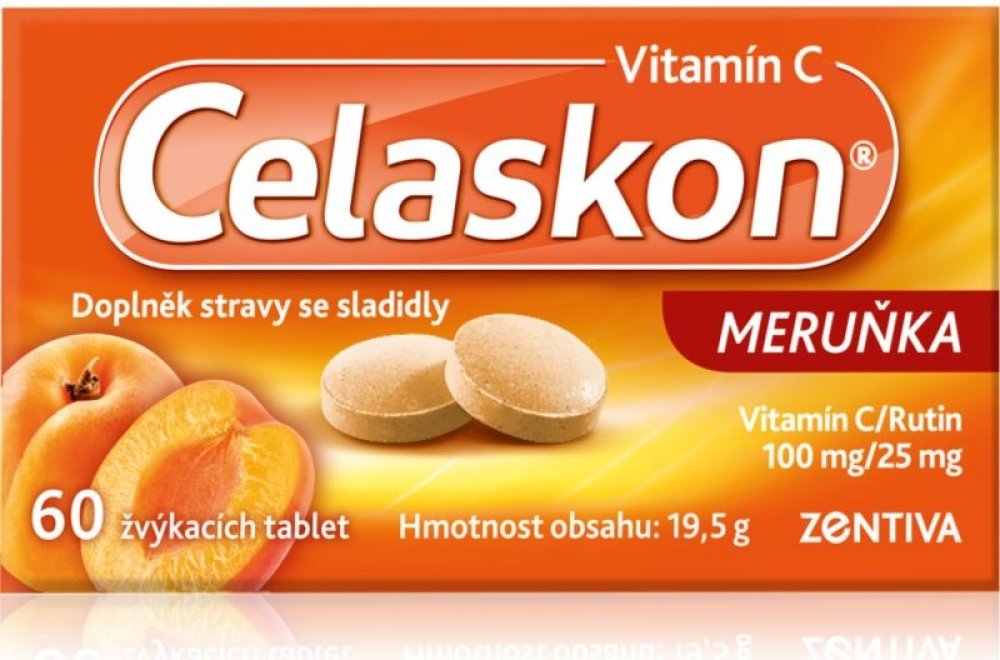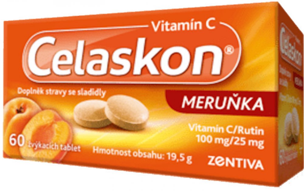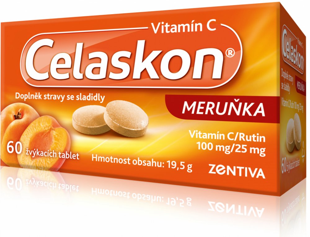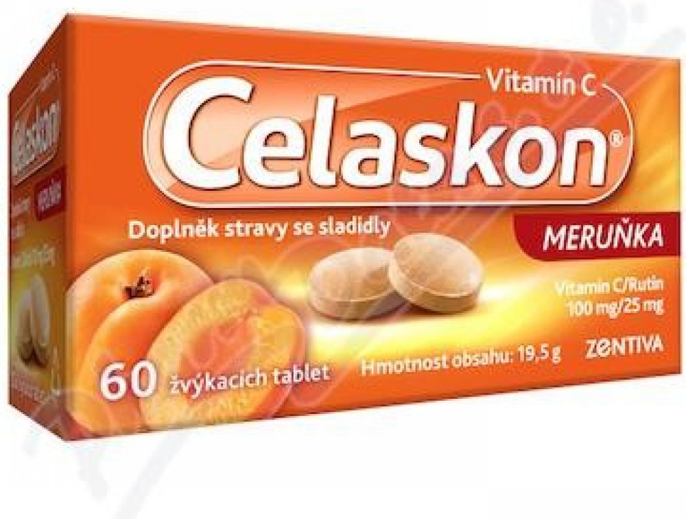 Celaskon je doplněk stravy v podobě žvýkacích tablet s příchutí meruňky. Celaskon obsahuje kombinaci vitamínu C a rutinu.