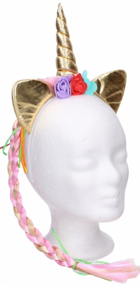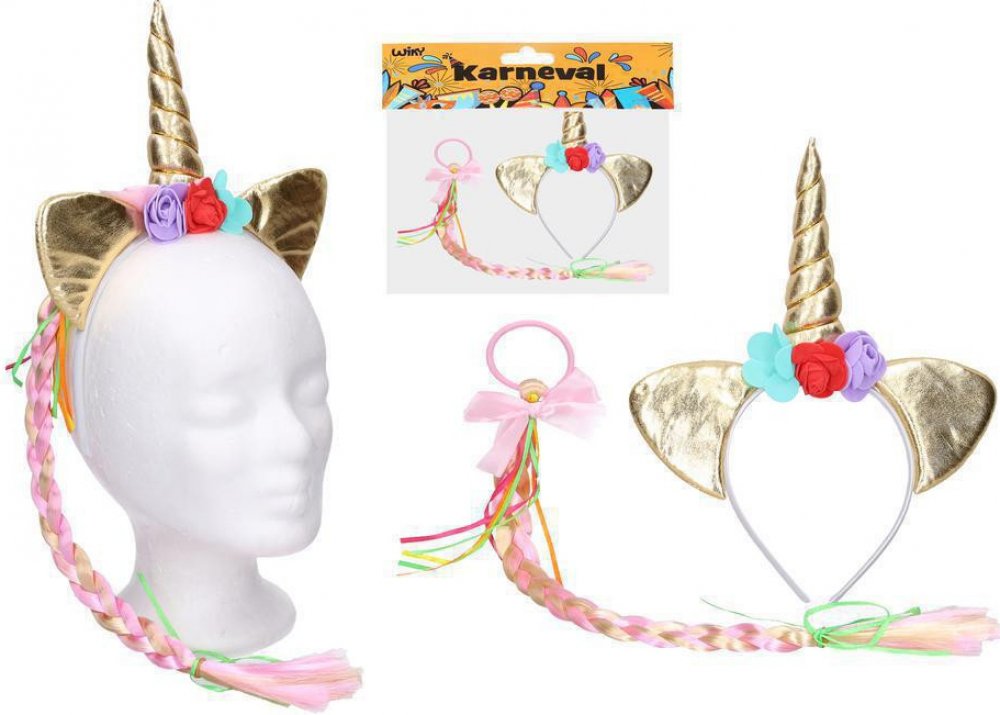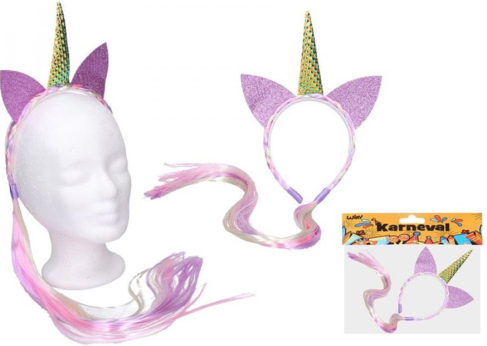 Karnevalový set díky kterému budete za krásného jednorožce. Balení obsahuje čelenku a příčesek ve tvaru copánku.