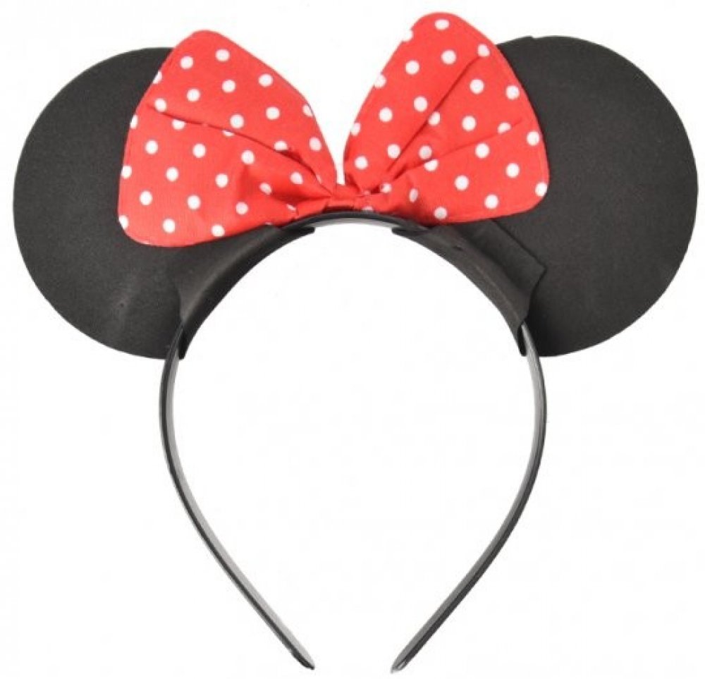 Party čelenka Minnie mouse s černýma ušima a červenou mašlí s bílými puntíky.