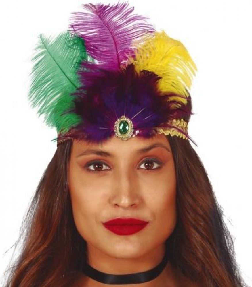 Luxusní flitrová čelenka Charleston s barevným peřím a ozdobným kamínkem.