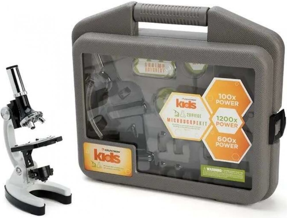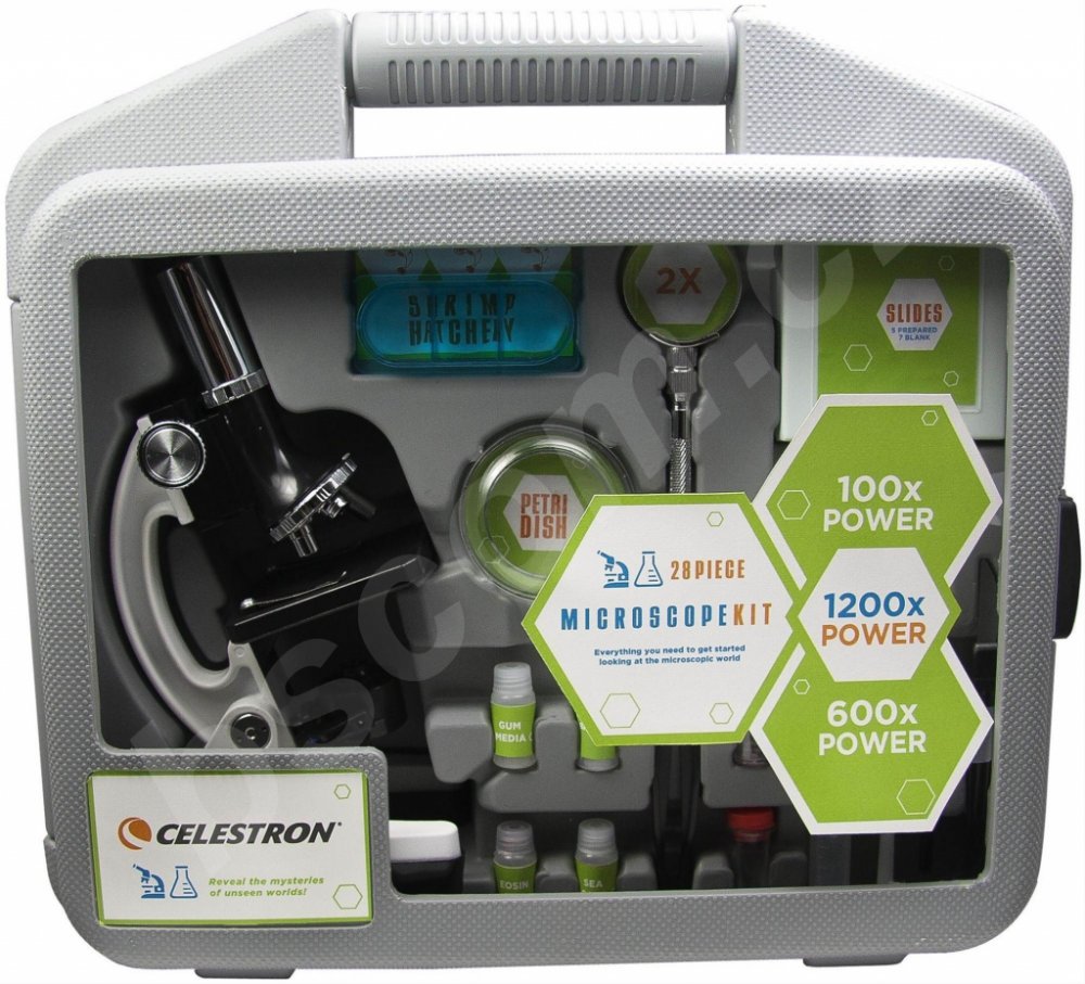 CELESTRON mikroskop KIT, 28 dílů v jednom kufru, kovové a plně nastavitelné tělo, 3 objektivy pro zvětšení 100x, 600x a 1200xMikroskop je perfektní přístroj pro objevování a poznávání světa, který nemůžeme vidět pouhým okem. Zvětšení snímané části až 1200x.