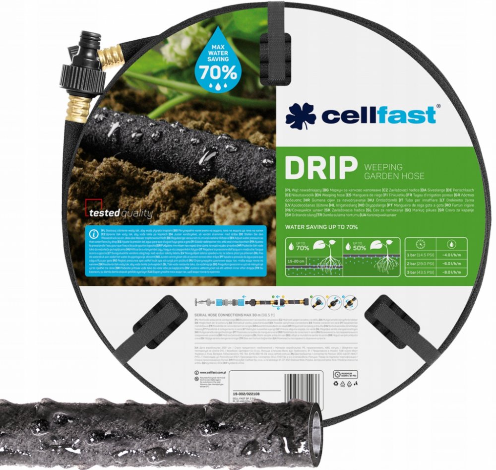 spotřeba vody v závislosti na pracovním tlaku; 3 bary = 6,8 - 7,2 l/h na 1 m; 2 bary = 5,6 - 6,4 l/h na 1 m; 1 bar = 0,4 - 5 l/h na 1 m