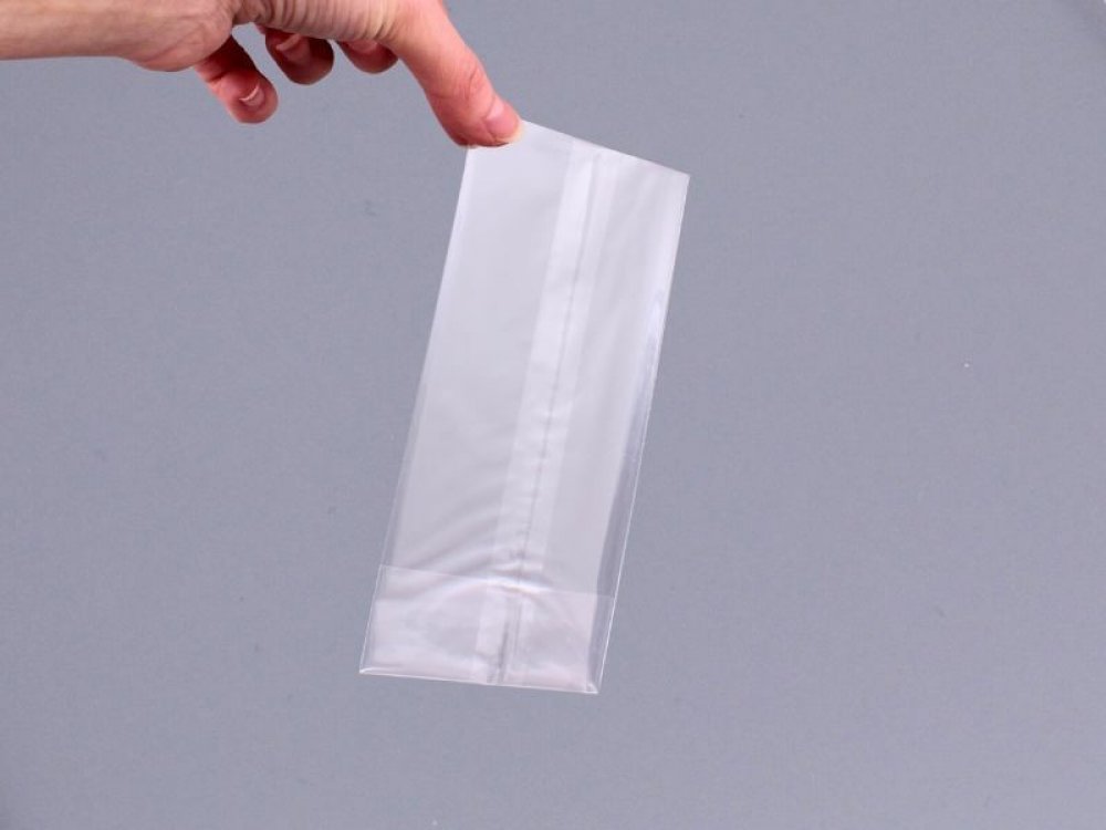 Průhledný sáček z polypropylenu (PP) s plochým svařovaným dnem. Sáček je vhodný pro balení drobností, může přijít do přímého styku s potravinami.