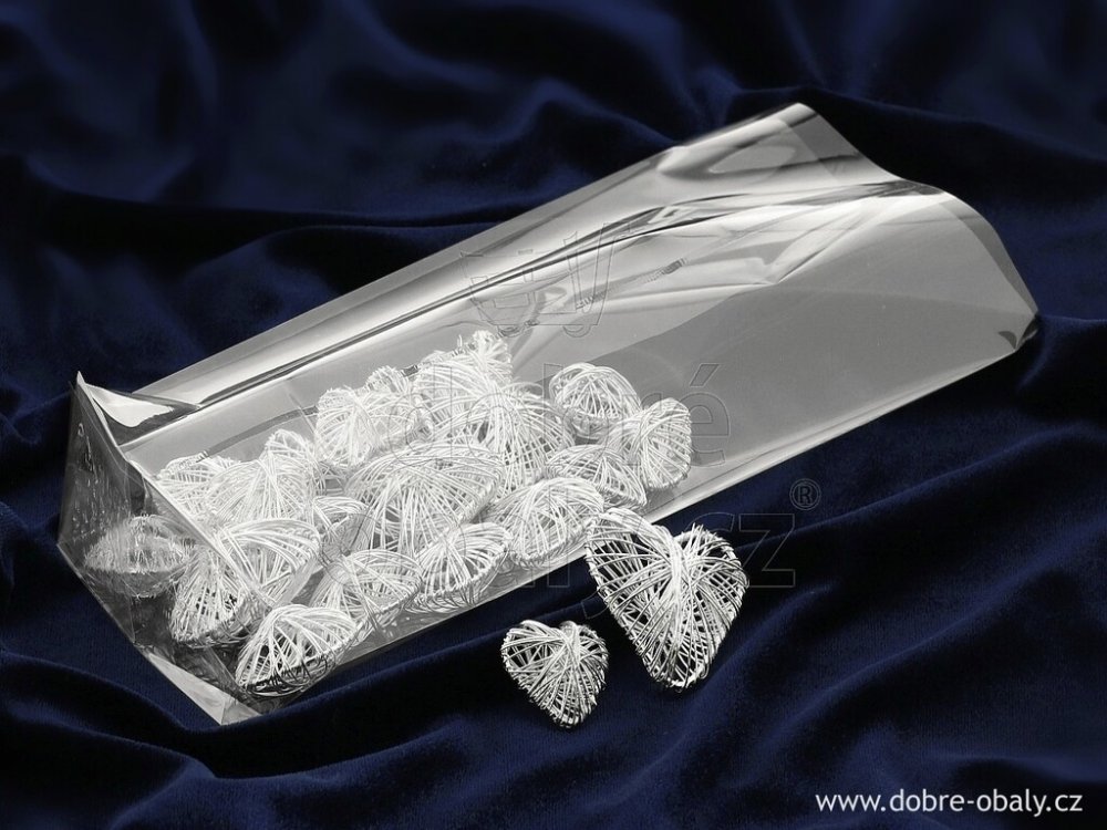 Kvalitní celofánový sáček vyrobený ze zcela transparentní fólie. Sáček nemá boční záložku, lepené vyztužené dno, spodní křížová záložka má hloubku 4 cm. Rozměry: šířka 9,5 cm, výška 16 cm. Materiál: BOPP fólie, obchodní název Tatrafán. Fólie je určená pro přímý styk s potravinami a je zdravotně nezávadná.