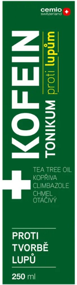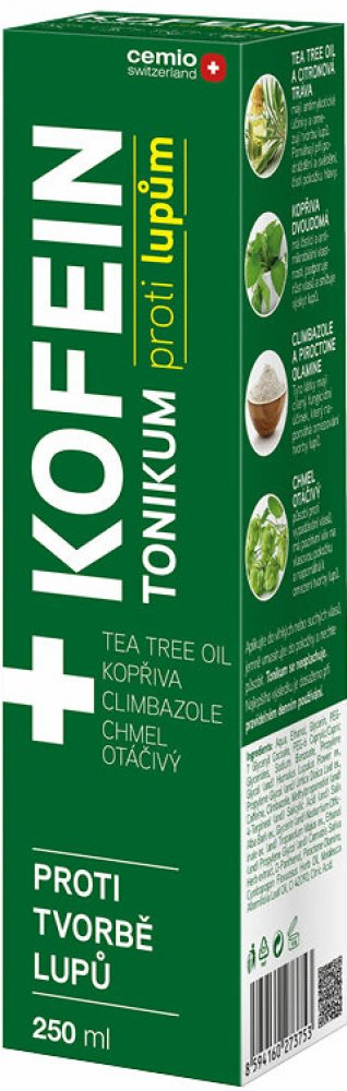 Cemio KOFEIN tonikum proti lupům je určeno jako doplňková péče pro suchou podrážděnou vlasovou pokožku se sklony k tvorbě lupů. Obsahuje pečlivě vybrané složky, které harmonizují vaši pokožku a vlasy. Tea tree olej s přírodními antibakteriálními účinky pomáhá bojovat proti podráždění pokožky, zatímco citronová tráva osvěžuje a zklidňuje. Obsahuje climbazol a piroctone olamine, které zabraňují množení kvasinek a bakterií na pokožce hlavy. Tonikum navíc pomáhá hydratovat pokožku hlavy.