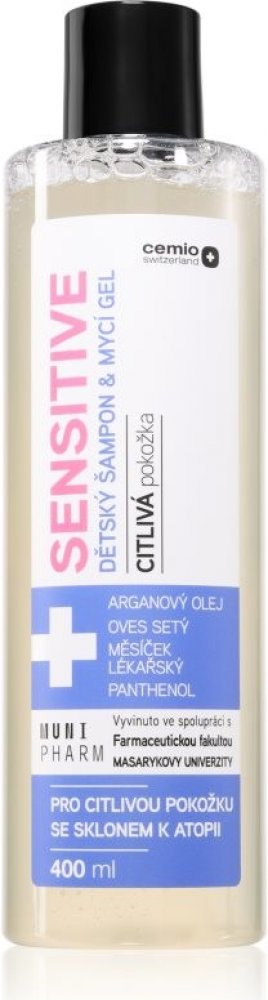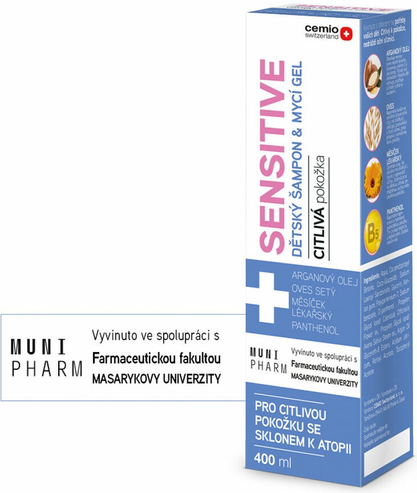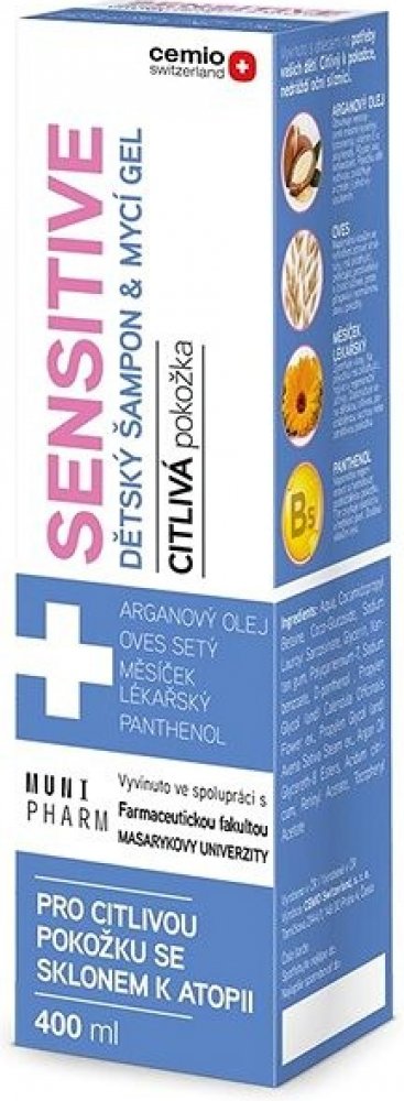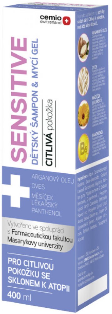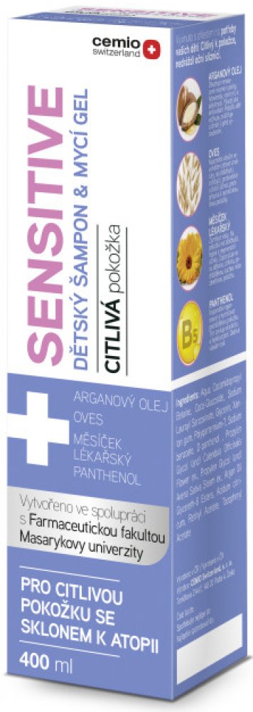 CEMIO Sensitive dětský šampon a mycí gel 400 ml Dětský šampon a mycí gel s arganovým olejem, ovsem setým, měsíčkem lékařským a panthenolem. Byl speciálně vyvinut s ohledem na potřeby Vašich dětí. Citlivý k pokožce, nedráždí oční sliznici. Určen pro citlivou pokožku se sklonem k atopii.