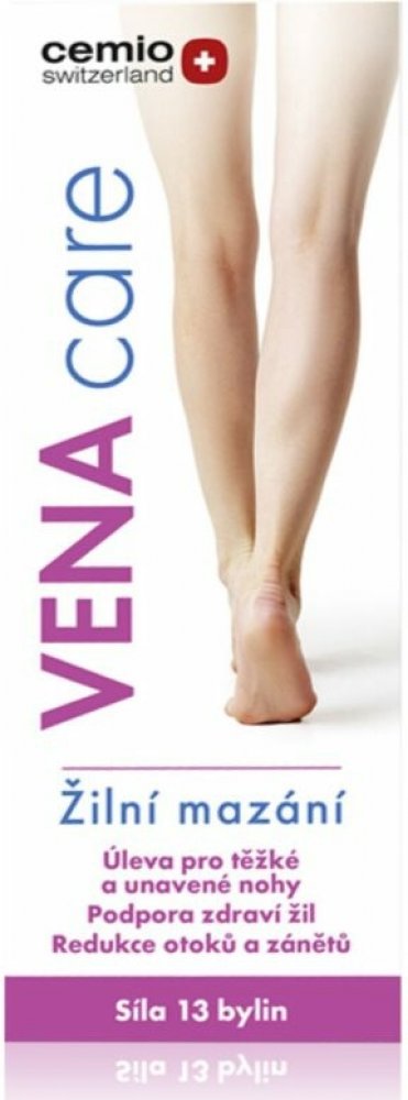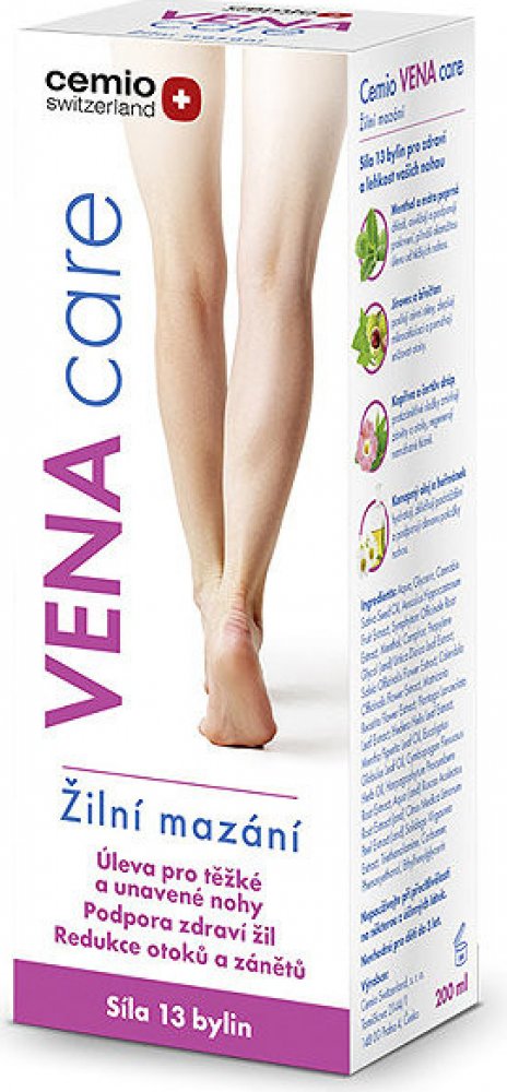 Cemio Vena care Žilní mazání200 ml Mazání s unikátní kombinací 13 bylinných extraktůCemio VENA care Žilní mazání s unikátní kombinací 13 bylinných extraktů pro péči o unavené, oteklé a namáhané nohy. Podporuje správnou mikrocirkulaci, napomáhá snižovat otoky a záněty a přináší okamžitý chladivý efekt díky mentholu a mátě peprné. Krém se dobře vstřebává, nezanechává mastný film a příjemně osvěžuje....