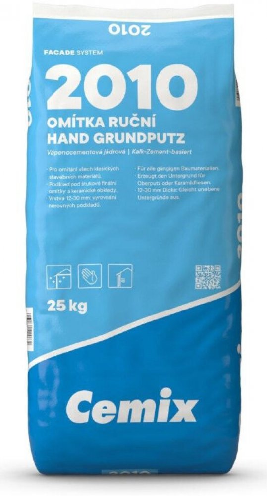 Ruční jádrová omítka pro vícevrstvé omítkové systémy. Omítka ruční Cemix 2010 je osvědčenou volbou pro běžné omítání a patří mezi nejprodávanější vápenocementové jádrové omítky. Je určena pro ruční nanášení a je vhodná pro omítání všech běžných stavebních materiálů. Omítka umožňuje nanášení vrstev o tloušťce 12–30 mm, čímž efektivně vyrovnává nerovné podklady a vytváří rovný a pevný podklad pro finální omítky nebo keramické obklady. Hodí se pro použití ve vnitřním i venkovním prostředí a zajišťuje kvalitní povrch stěn a stropů. Slouží pro vyrovnání stěn a stropů a zároveň jako podklad pod štukové omítky či keramické obklady, přičemž umožňuje jednoduché ruční zpracování.