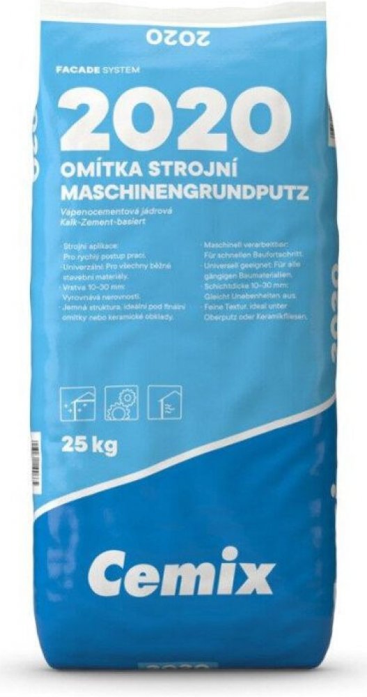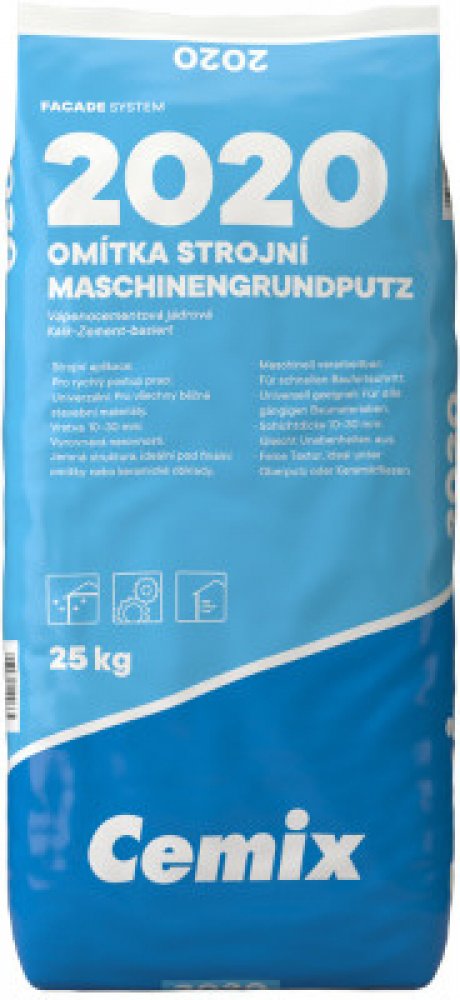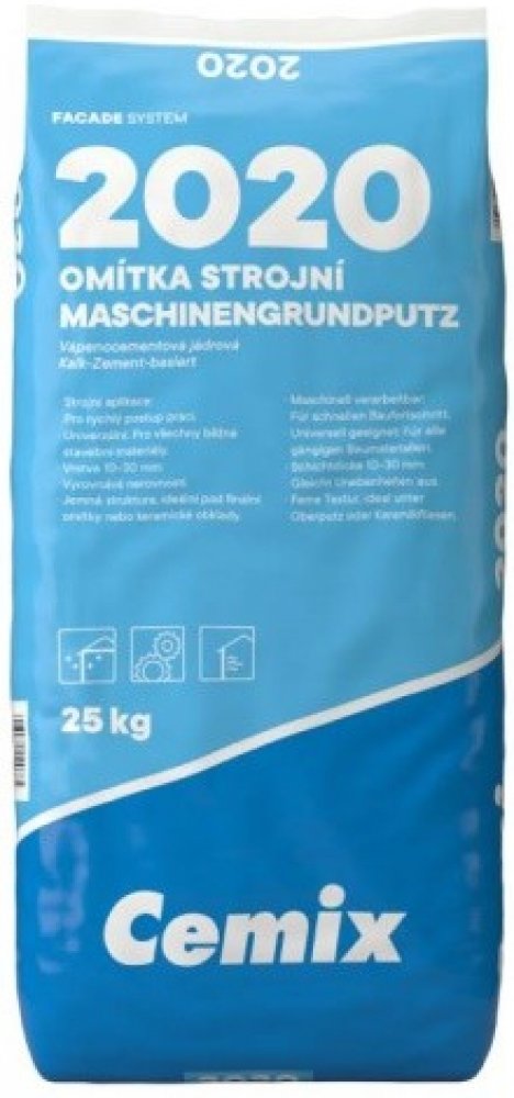 Strojní jádrová omítka pro vícevrstvé omítkové systémy. Omítka strojní Cemix 2020 je univerzální vápenocementová jádrová omítka určená pro strojní zpracování. Je ideální pro omítání všech běžných stavebních materiálů a umožňuje rychlý postup prací, čímž šetří čas. Omítku lze aplikovat v tloušťkách 10–30 mm, čímž vyrovnává nerovnosti podkladu a vytváří rovný a hladký povrch. Jemná struktura omítky ji předurčuje jako kvalitní podklad pro finální omítky nebo keramické obklady. Lze ji použít ve vnitřním i venkovním prostředí na stěny a stropy. Omítka Cemix 2020 zajišťuje rovnoměrný povrch a usnadňuje další dokončovací práce.