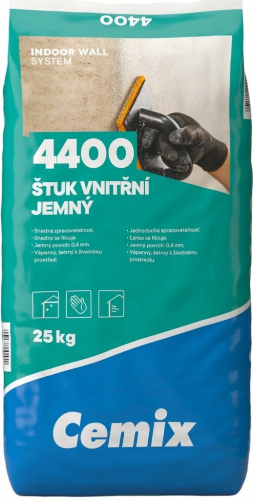 Cemix 4400 štuk vnitřní jemný - extra jemný povrch Cemix 4400 štuk vnitřní jemný je tradiční vápenná omítka šetrná k životnímu prostřední určená pro ruční zpracování na finální úpravu stěn místností v interiéru (stěna + strop). Pro povrchové úpravy jádrových podkladních omítek. Má extra jemný povrch, jemnou zrnitost 0,4 mm, je snadno vyhladitelná, přirozeně antibakteriální, protiplísňová a paropro...