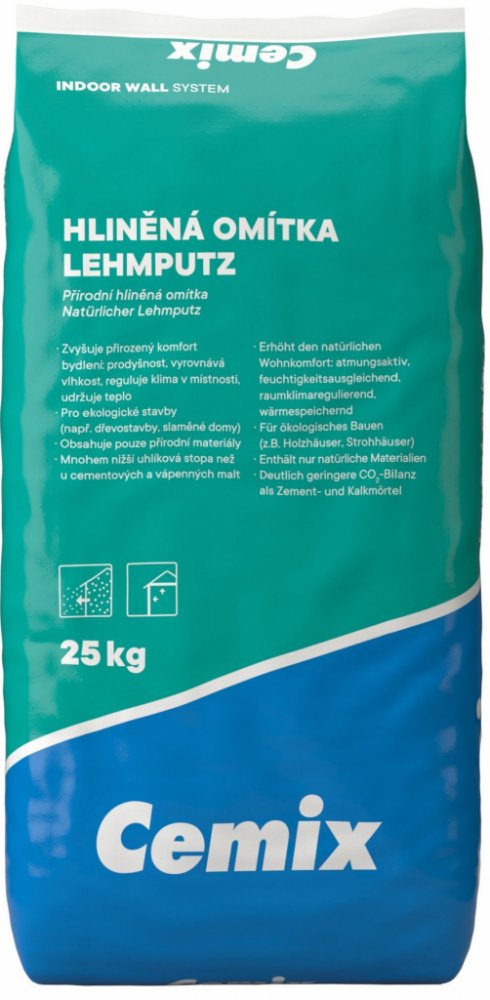 hliněná jádrová omítka, pro ruční omítání zejména hliněných, ale i běžných stavebních materiálů, do interiéru, aplikační tl. 10–20 mm, zrnitost 2,0 mm, spotřeba 16,5 kg/m2/10 mm
