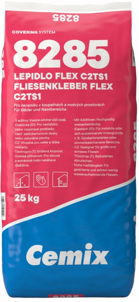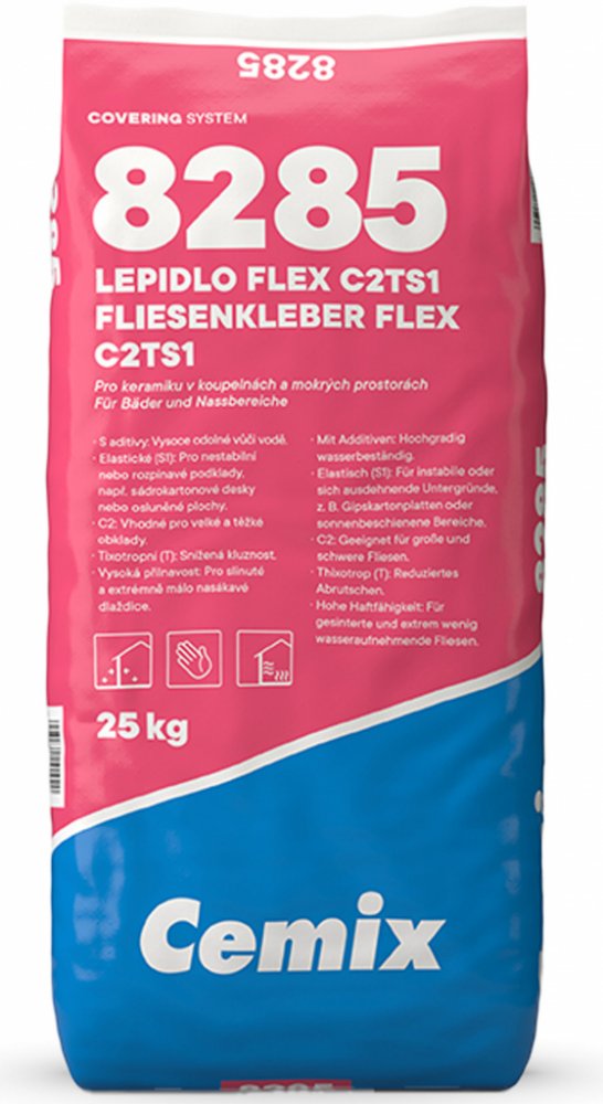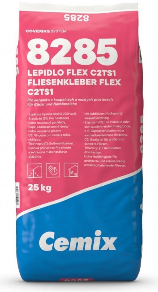 Flexibilní cementové lepidlo C2TS1 pro lepení keramických obkladových prvků. Cemix Lepidlo FLEX C2TS1 8285 je vysoce kvalitní flexibilní cementové lepidlo určené pro lepení všech typů keramických obkladů a dlažeb, včetně slinutých a málo nasákavých. Díky příčné deformovatelnosti (S1) je ideální pro problematické a nestabilní podklady, jako jsou sádrokartonové či cementovláknité desky. Lepidlo má vysokou odolnost proti vodě, a proto je vhodné do vlhkých prostor, garáží nebo na osluněné plochy. Tixotropní vlastnosti zaručují snížený skluz při obkládání svislých ploch. Výborně drží i těžké obklady a je vhodné pro vytápěné podlahy i venkovní terasy.