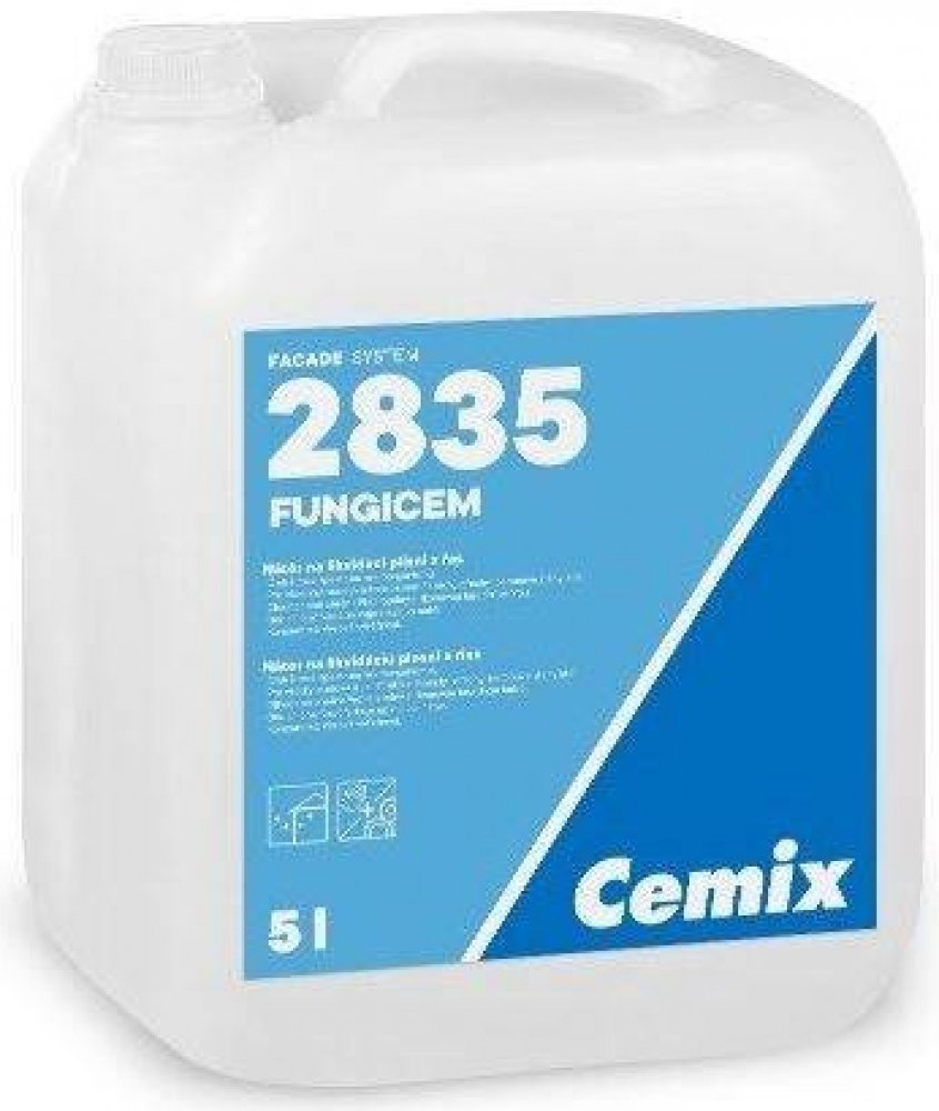 Nátěr na likvidaci plísní a řasPrevence řas, plísní, mechů a lišejníkůČisticí prostředek: Odstraňuje široké spektrum plísní a řas, mechů a lišejníků.Pro všechny budovy a konstrukce v interiéru i exteriéru: Fasády, střechy, betonové zdi, obklady, dlažby a přírodní kameny atd.Dlouhodobá ochrana: Zlepšuje ochranu fasády před natřením fasádní silikonovou barvou, např. Cempaint extra. Obsahuje dlouhodobě účinné přísady.Neobsahuje chlór: Nebělí ani nenarušuje stávající nátěr.Koncentrát: Vysoká výtěžnost ve zředěném stavu.Cemix 2835 Fungicem – 5 lCemix 2835 Fungicem je koncentrovaný čisticí prostředek určený k odstranění a prevenci výskytu řas, plísní, mechů a lišejníků na různých stavebních površích. Vhodný pro použití v interiéru i exteriéru, na fasády, střechy, betonové zdi, obklady, dlažby a přírodní kameny.Vlastnosti a výhodyEfektivně odstraňuje široké spektrum mikroorganismůNeobsahuje chlór – nepoškozuje podkladové materiályVysoká výtěžnost díky koncentrované forměVhodný pro ruční i strojní aplikaciPro interiérové i exteriérové použitíTechnické parametrySpotřeba: cca 0,1–0,4 l/m² (v závislosti na savosti podkladu)Ředění: 1 díl přípravku na 2 díly vodyHustota: cca 985 kg/m³Balení: 5 l plastový kanystrSkladovatelnost: 12 měsíců v originálním obalu při teplotě +5 až +30 °COblasti použitíFasády, střechy, betonové zdiObklady, dlažby, přírodní a umělý kámenZámkové dlažby, terasy, schodištěInteriérové stěny a stropyNávod k použitíPříprava podkladu: Odstraňte mechanicky mechy, lišejníky a silné vrstvy řas (např. kartáčem), povrch očistěte od nečistot.Příprava směsi: Před použitím přípravek důkladně promíchejte. Nařeďte v poměru 1:2 s pitnou vodou a znovu promíchejte.Aplikace: Nanášejte rovnoměrně na podklad pomocí válečku nebo štětky do plného nasycení podkladu.Odstranění mikroorganismů: Po 24 hodinách (nejpozději do 7 dnů) od aplikace odstraňte odumřelé mikroorganismy mechanicky nebo omytím tlakovou vodou (max. 50 bar).Opakování: V případě potřeby postup opakujte. Pro zvýšení odolnosti a snížení nasákavosti doporučujeme ošetřenou plochu opatřit fasádním nátěrem na silikonové bázi.