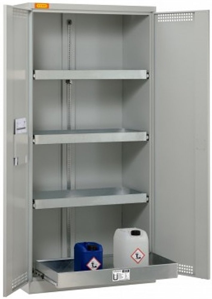 Bezpečnostní skříně jsou vyrobeny z vysoce kvalitní oceli, jsou schválené dle směrnice StawaR. Nejsou vhodné pro skladování hořlavých látek. Dveře jsou uzamykatelné s cylindrickým zámkem, skříň je vysoce kvalitně práškově lakovaná v šedé barvě (RAL 7035), otvory ve dveřích umožňují přirozené větrání. Všechny police jsou koncipovány jako záchytné vany, jsou pozinkované a všechny jsou výsuvné, což u...