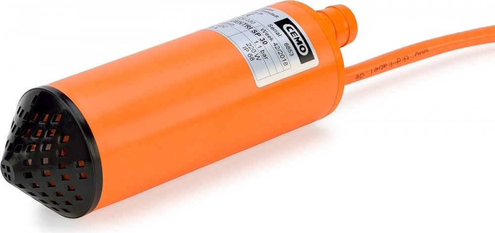 Ponorné elektrické čerpadlo CENTRI SP 30 s napájením 12V, 18A max. výkon 50 l/min s přívodním kabelem 1,5 metru a výstupem na hadici o vnitřním průměru 19 mm.