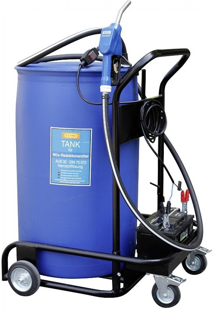 Kovový vozík pro převoz sudu 200 litrů s AdBlue s výdejním zařízením. Součástí vozíku je ponorné čerpadlo na AdBlue SP 30 12V, výdejní hadice 4 metry s automatickou pistolí. Na vozíku je plošina, na kterou lze umístit klasickou autobaterii pro nezávislé napájení čerpadla.