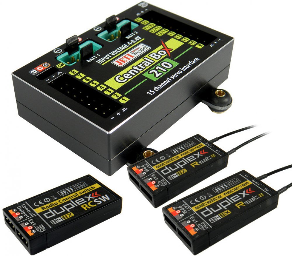 Central Box 210 nabízí až 15 výstupů pro serva, podporuje dvě nezávislé napájecí baterie a umožňuje připojení RC či magnetického spínače.