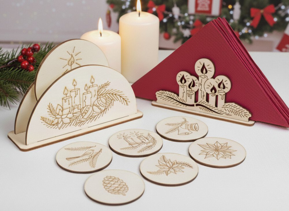 Vánoční dřevěný set podtácků se stojánkem – stylový doplněk pro váš domov