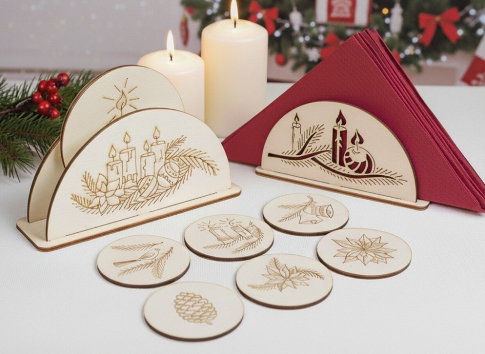 Vánoční dřevěný set podtácků se stojánkem – stylový doplněk pro váš domov