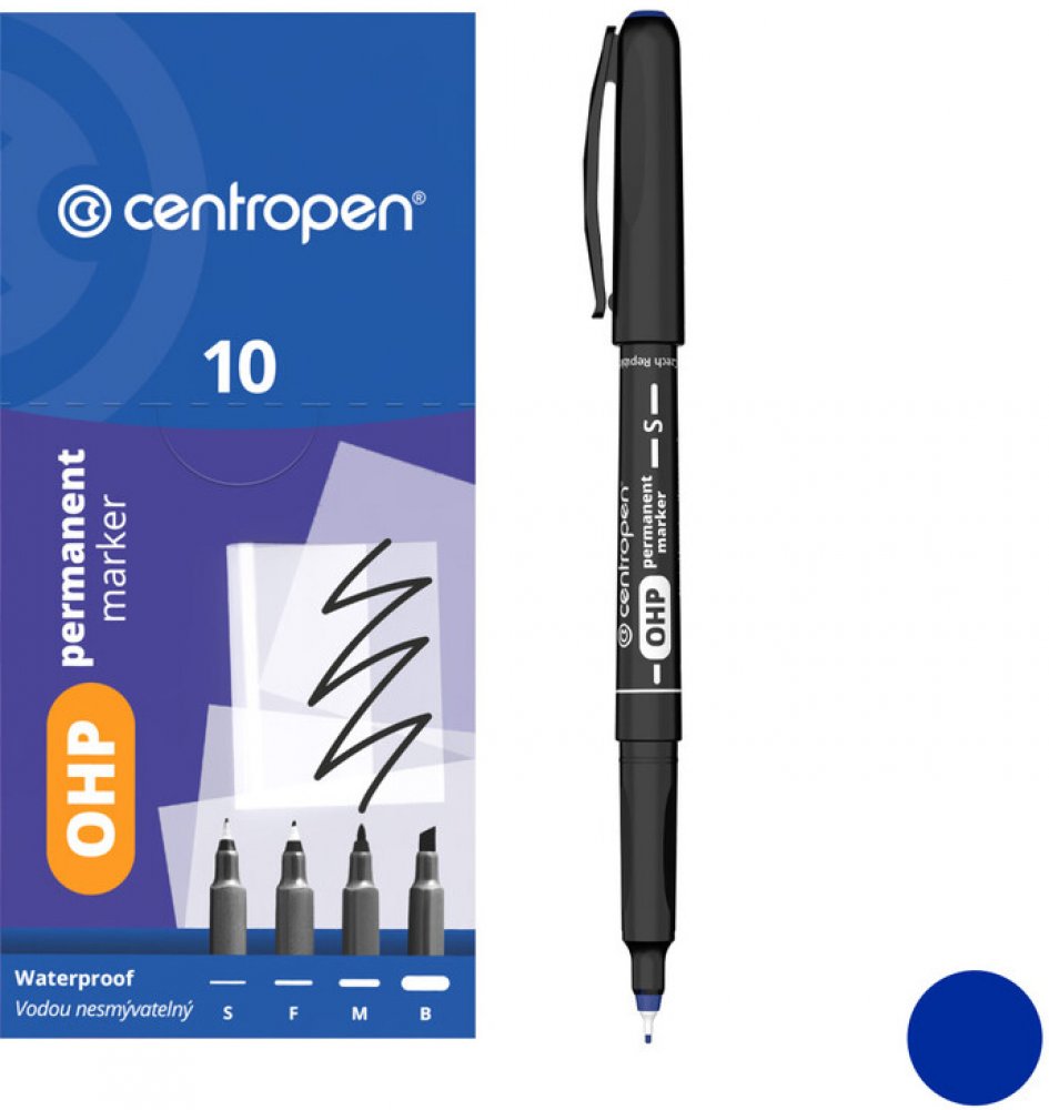 Centropen 2634 je pernamentní popisovač, píše na neporézní povrchy, má moderní desing s ERGO držením a odolává vodě a otěru.