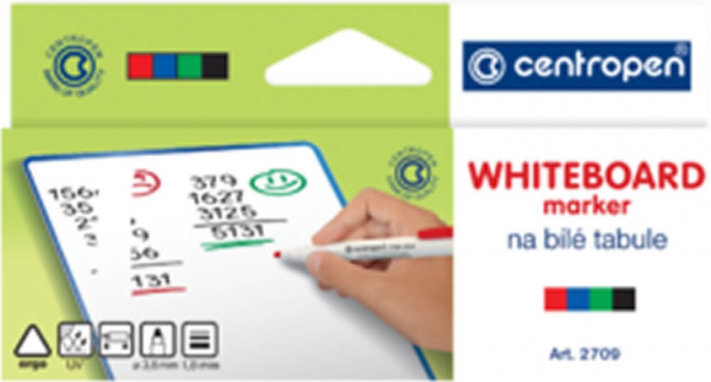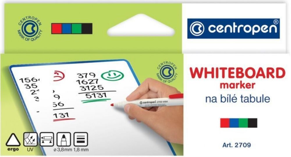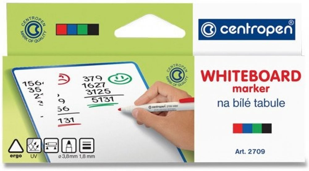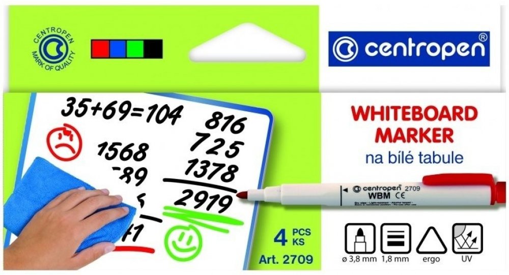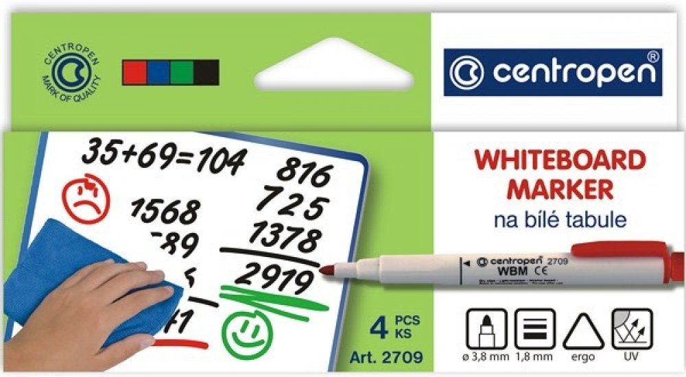 Centropen WHITEBOARD MARKER 2709 Stíratelný WBM je značkovač na bílé tabule s válcovým hrotem. Centropen 2709 Stíratelný - WBM je zdravotně nezávadný a vyžaduje skladování ve vodorovné poloze.