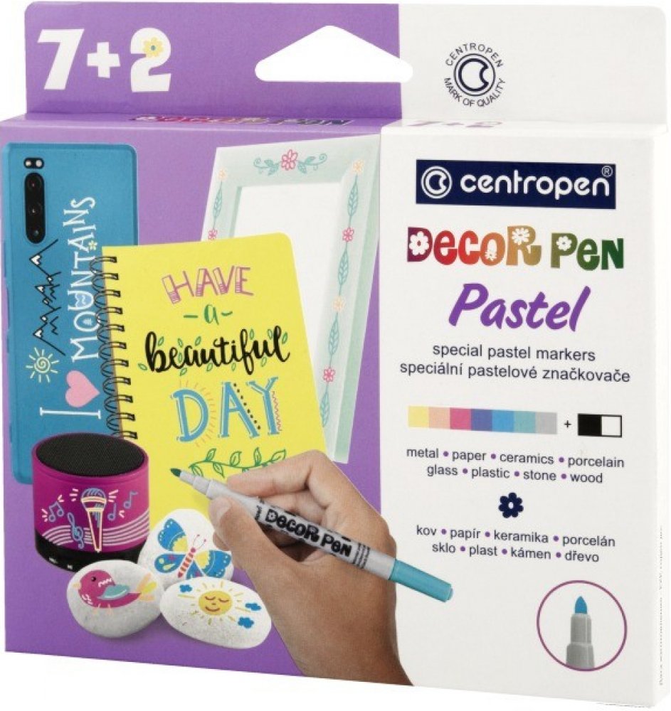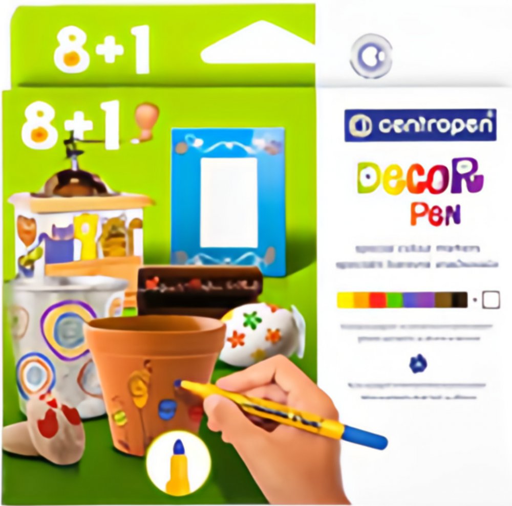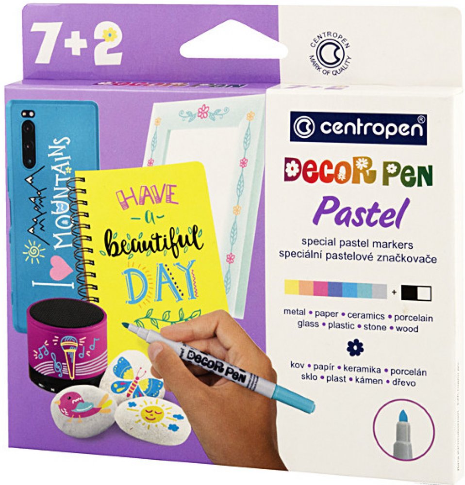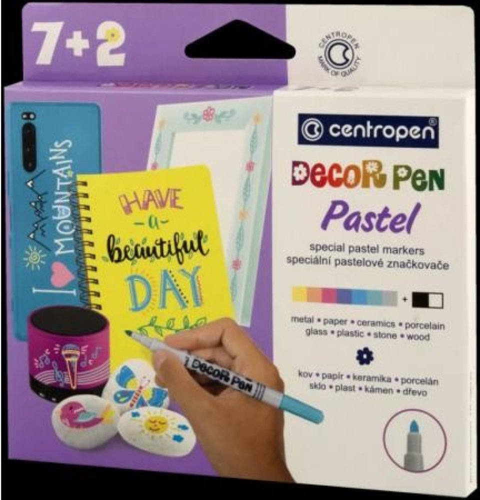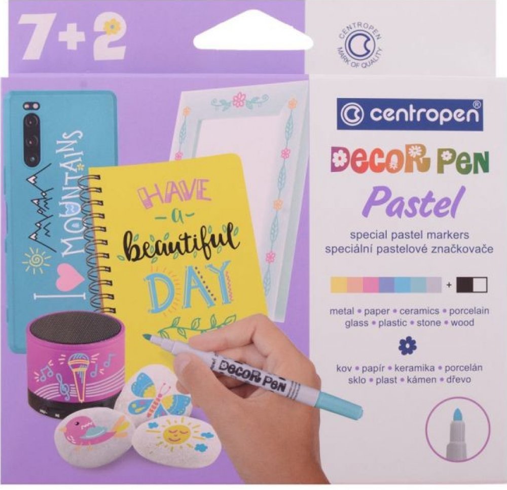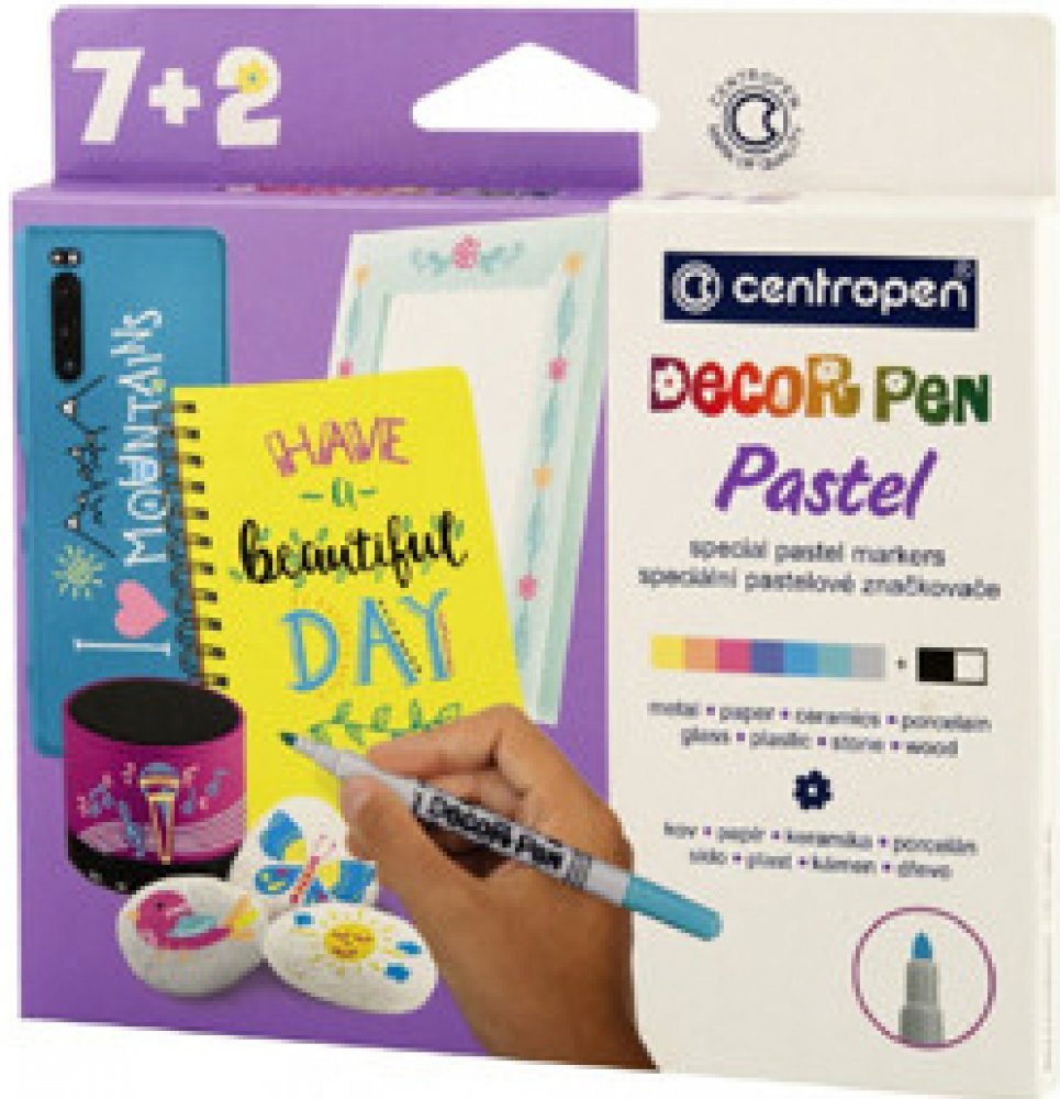 Každý malý kreslíř jistě ocení fixy Centropen. Díky kulatému tvaru je práce s nimi maximálně pohodlná. Fixy o šířce stopy 1,5 mm budou mít dostatečně výrazné tahy. Fixy jsou voděodolné, jsou tedy vhodné na drsnější povrchy, například na kámen či dřevo. Náplň je z inkoustu na vodní bázi, který vám jen tak nevyschne. Balení obsahuje 9 kusů. Centropen fixy jsou vhodné pro děti od 3 let. Klíčové přednosti fixů CENTROPEN Decor pen 2738 pastel 8+1 ks Fixy Centropen poslouží zejména malým umělcům Kulatý tvar fixů je příjemný na manipulaci Hodí se na porcelán Mají voděodolné vlastnosti Náplň je charakteristická inkoustem na vodní bázi V balení najdete 9 fixů Kvalitní hrot je kulatý a šířka jeho stopy je 1,5 mm
