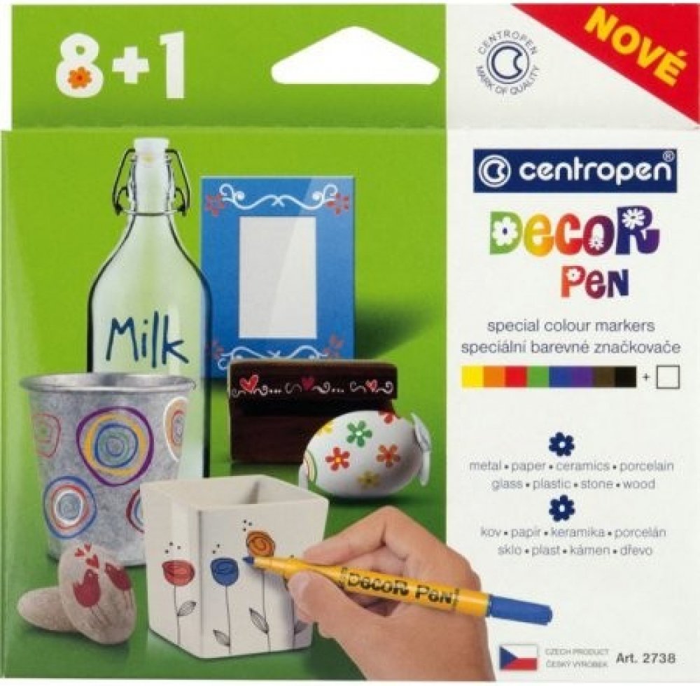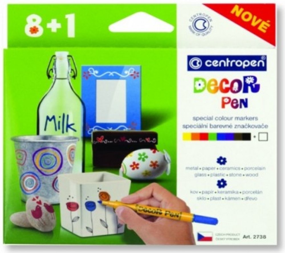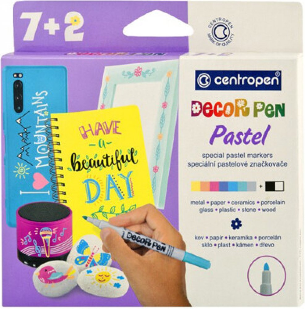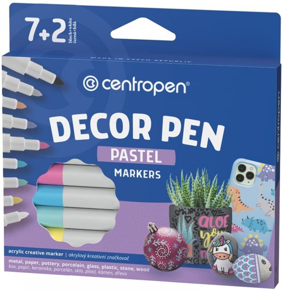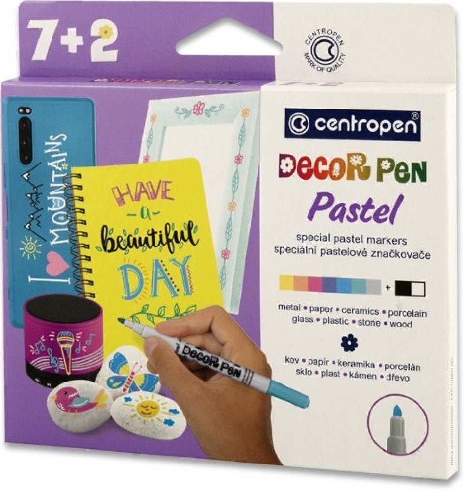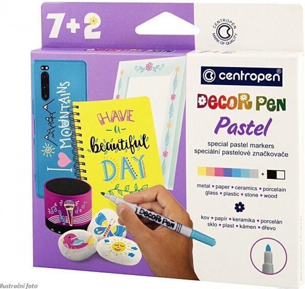 Každý malý kreslíř jistě ocení fixy Centropen. Díky kulatému tvaru je práce s nimi maximálně pohodlná. Fixy o šířce stopy 1,5 mm budou mít dostatečně výrazné tahy. Fixy jsou voděodolné, jsou tedy vhodné na drsnější povrchy, například na kámen či dřevo. Náplň je z inkoustu na vodní bázi, který vám jen tak nevyschne. Balení obsahuje 9 kusů. Centropen fixy jsou vhodné pro děti od 3 let. Klíčové přednosti fixů CENTROPEN Decor pen 2738 pastel 8+1 ks Fixy Centropen poslouží zejména malým umělcům Kulatý tvar fixů je příjemný na manipulaci Hodí se na porcelán Mají voděodolné vlastnosti Náplň je charakteristická inkoustem na vodní bázi V balení najdete 9 fixů Kvalitní hrot je kulatý a šířka jeho stopy je 1,5 mm