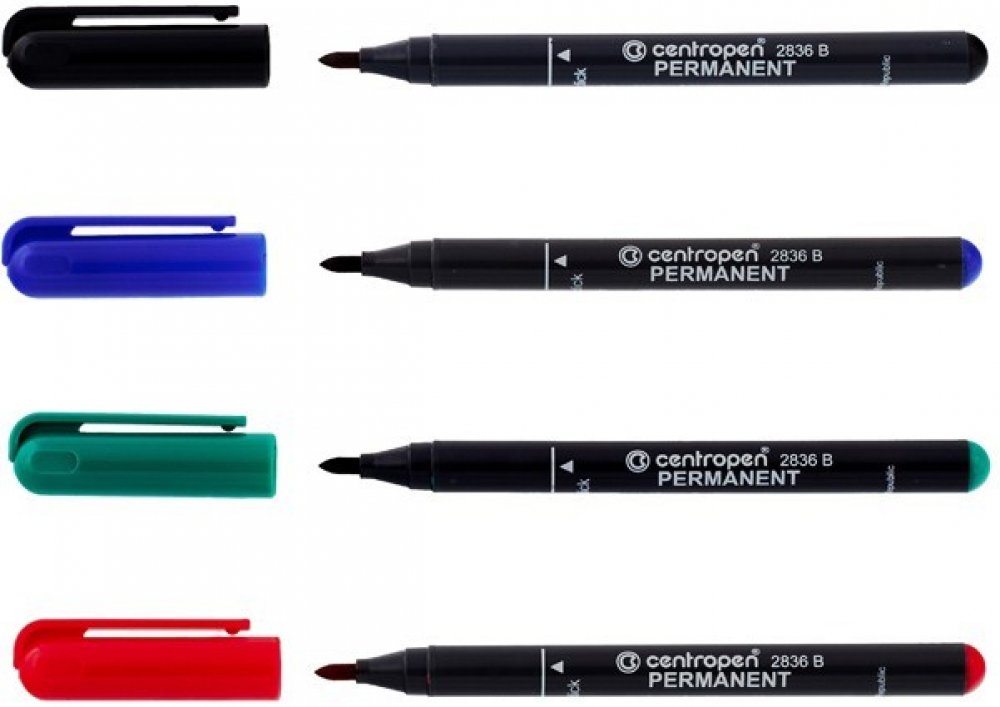 Centropen 2836 je pernamentní popisovač, má inkoust na alkoholové bázi, odolá vodě, otěru a povětrnostním vlivům. Píše na většinu povrchů.