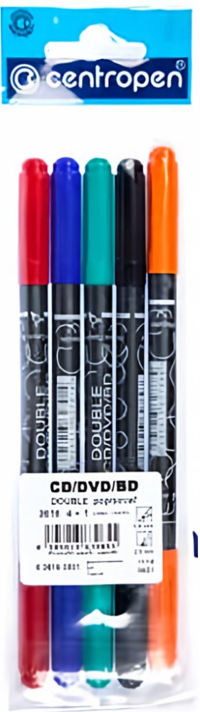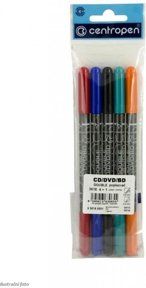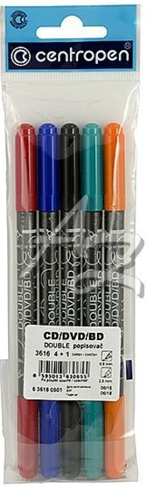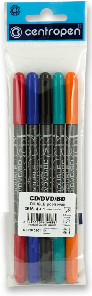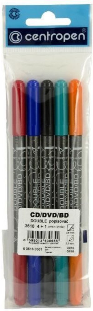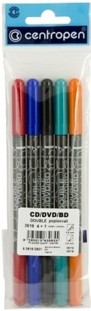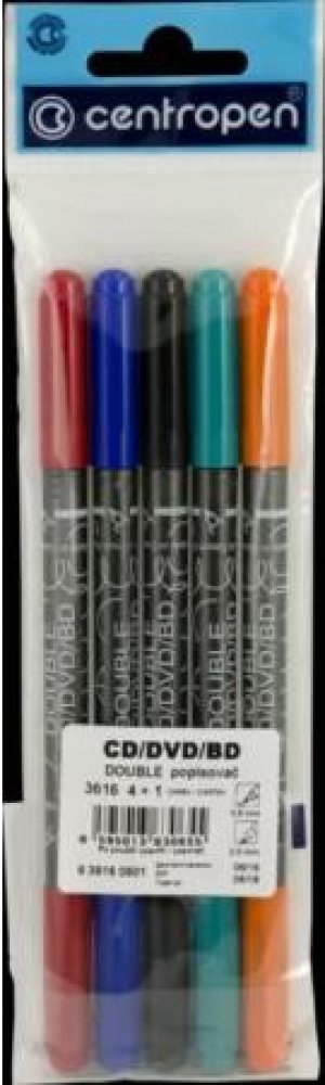 Speciální popisovač CENTROPEN 3616 Double se dvěma různými hroty, určený na popisy CD, DVD, BD disků. Trojúhelníkové ERGO držení na obou stranách. Permanentní inkoust na alkoholové bázi. Válcový hrot - šíře stopy 2,5 mm. Jemný hrot - šíře stopy 0,6 mm. Sada 4 + 1 ks.Doplňující popis: