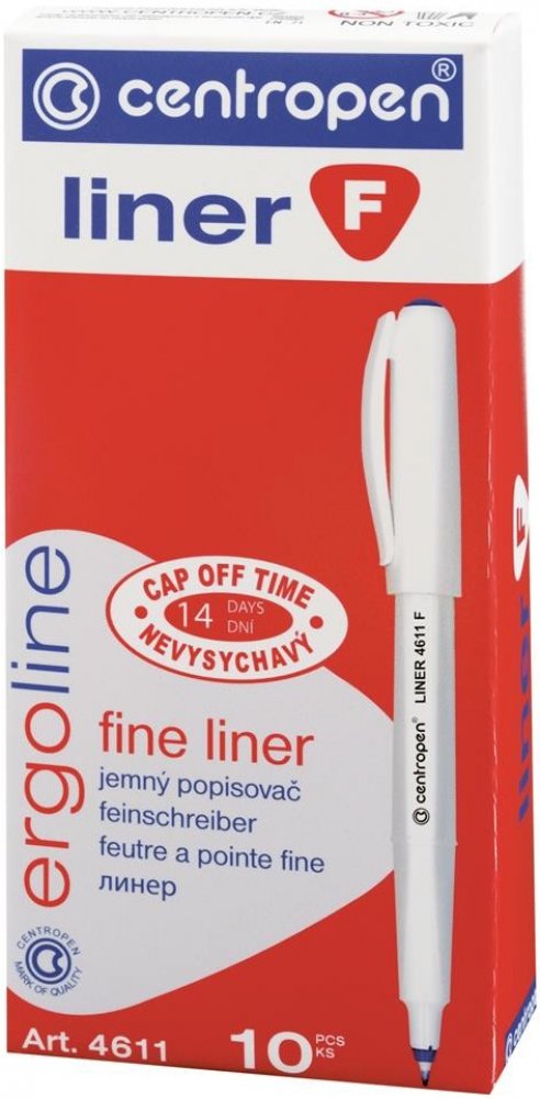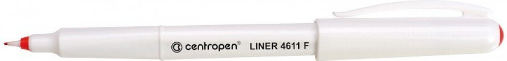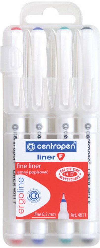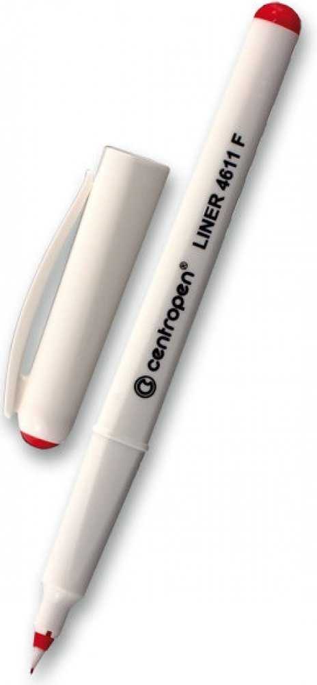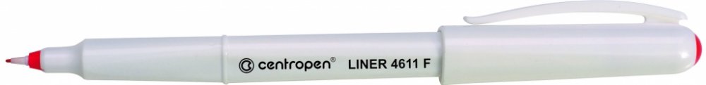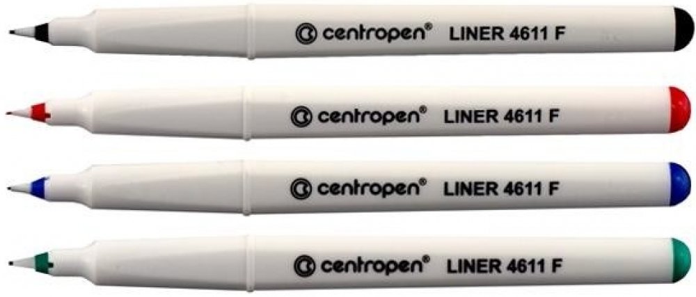 Centropen 4611 je liner s novým ergonomickým designem, obsahuje nevysychavý inkoust (vydrží i 14 dní bez chránítka), má jemný plastový hrot. Je vhodný na papír a obsahuje inkoust na vodní bázi, který je bez zápachu.
