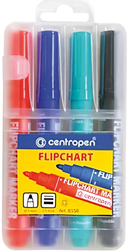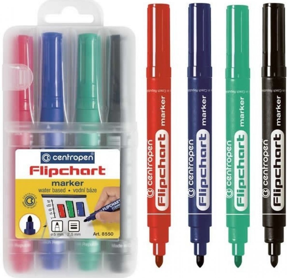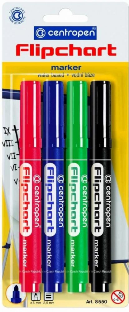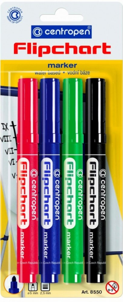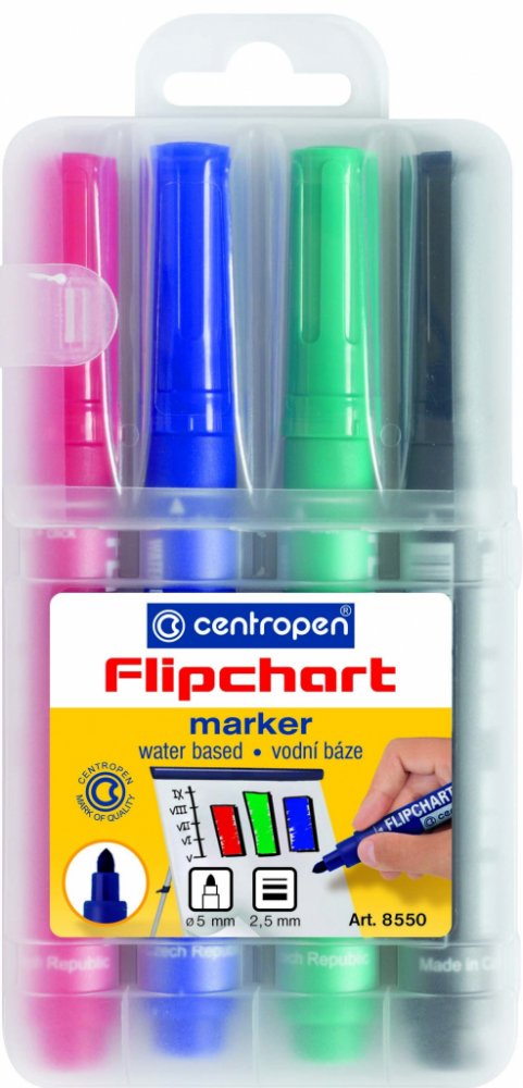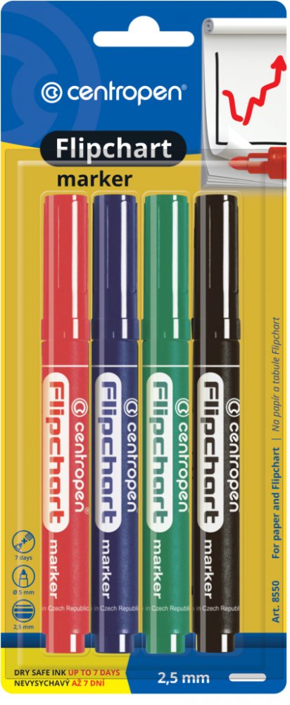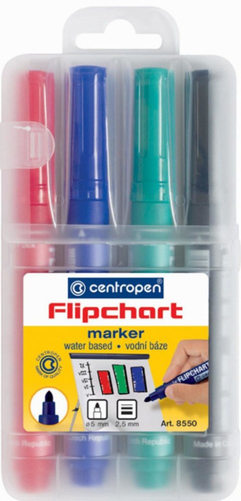 Centropen 8550 FLIPCHART je značkovač na papírové tabule. Centropen FLIPCHART 8550 má klínový hrot. ART. 8550 po otevření má funkčnost jeden týden.