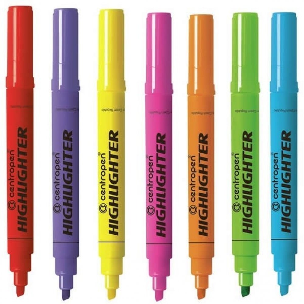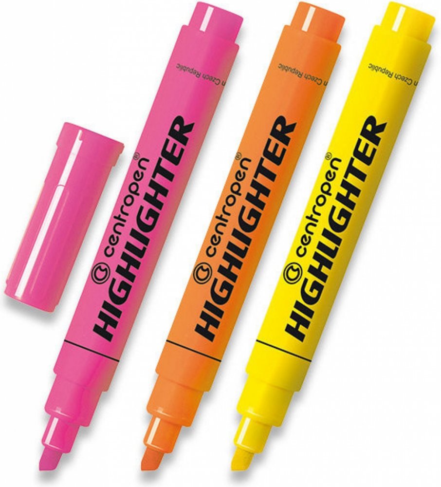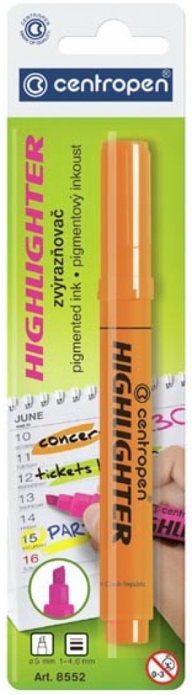 Velkokapacitní zvýrazňovač Centropen 8552 ve výrazné oranžové barvě je ideálním pomocníkem pro zvýrazňování textů ve škole, kanceláři i doma. Speciální fluorescenční pigmentový inkoust je vhodný na všechny druhy papíru – včetně faxového či kopírovacího.