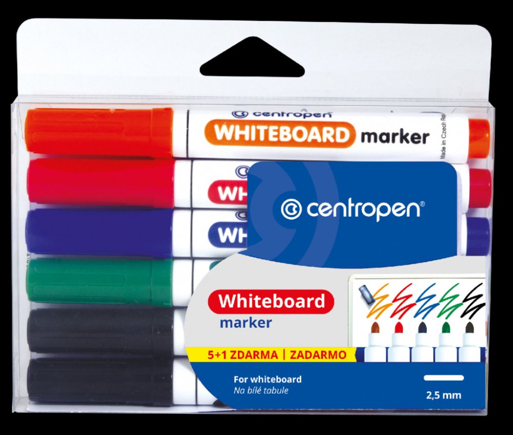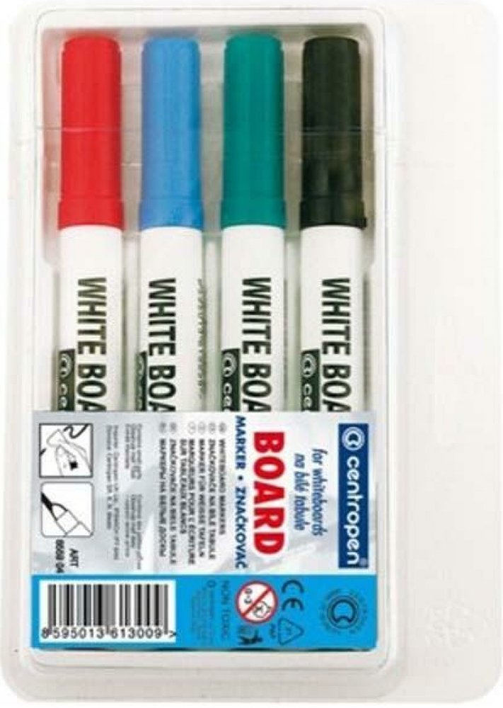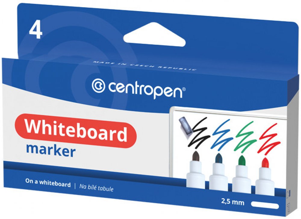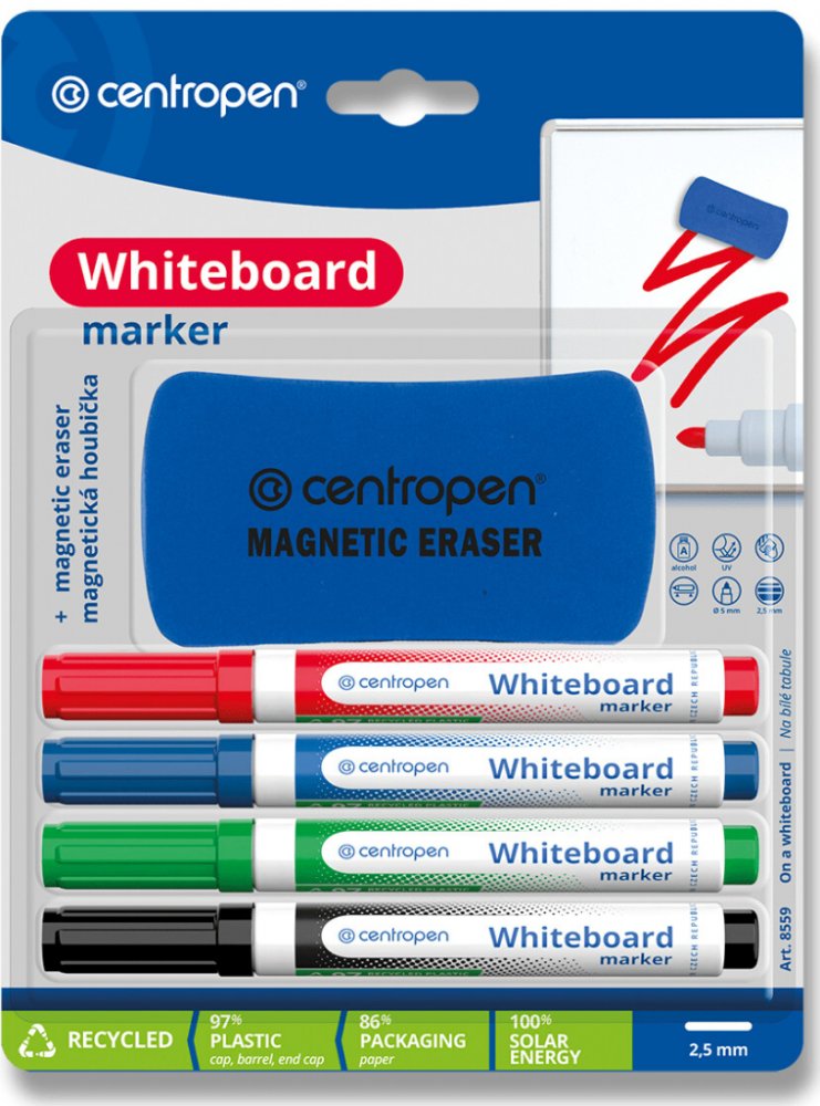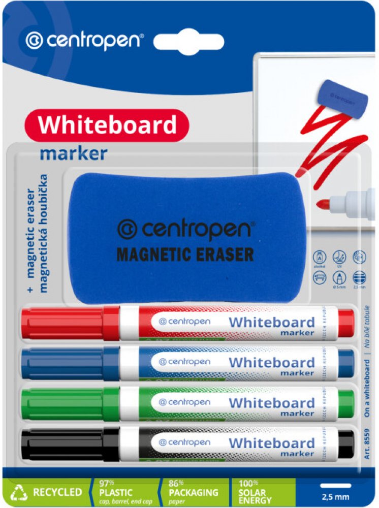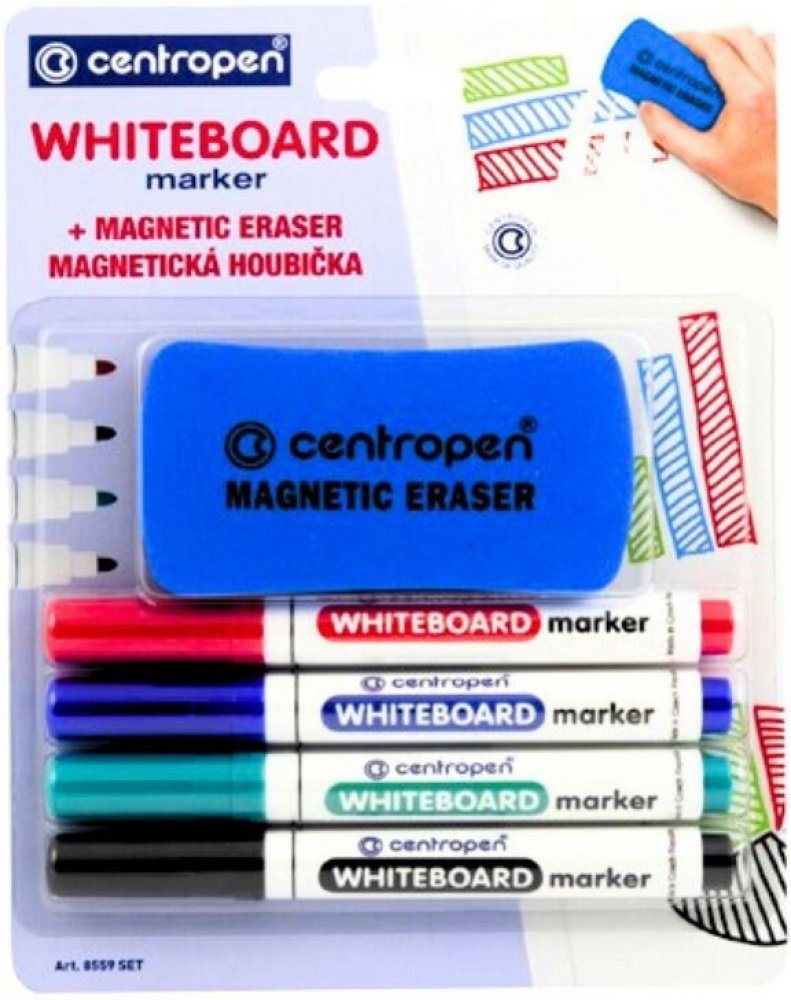 - Sada 4 barev (černá, červená, zelená, modrá) s magnetickou houbičkou na blistru.