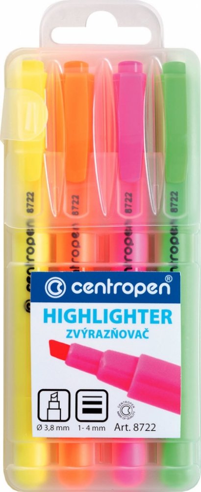 Centropen zvýrazňovač 8722 ve výhodné sadě 4 kusů nabízí spolehlivé a syté zvýraznění textu na papíře. Ergonomický tvar a seříznutý hrot umožňují přesné podtržení i široké zvýraznění. Díky kvalitnímu inkoustu jsou zvýrazňovače vhodné pro běžný kancelářský i zdravotnický papír.