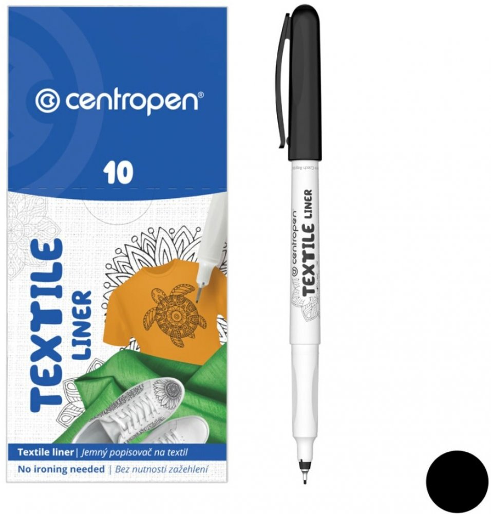 Centropen popisovač s pigmentovým inkoustem na vodní bázi je určen na všechny běžné textilní látky. Plastový hrot v kovové objímce má šířku linky 0,6 až 0,8 mm. Po aplikaci není nutné barvu zažehlovat. Barvy lze prát do teploty 60°C. Popisovače je nutné skladovat ve vodorovné poloze.
