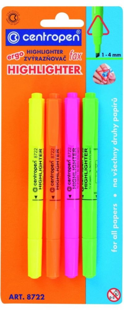 Zvýrazňovače dobře poslouží jak dětem ve škole, tak i dospělým v kanceláři či pracovně. V případě, že byste si rádi označili důležité věty v textu, zvýrazňovač Centropen se vám bude líbit. Modrá barva zvýrazňovače je permanentní a dokument můžete bez rpoblémů vložit i do kopírky. Jeho inkoust nelze smazat a nerozmaže vám zvýrazňovaný text. Se zkoseným hrotem vám půjde práce krásně od ruky. Jedná-l...
