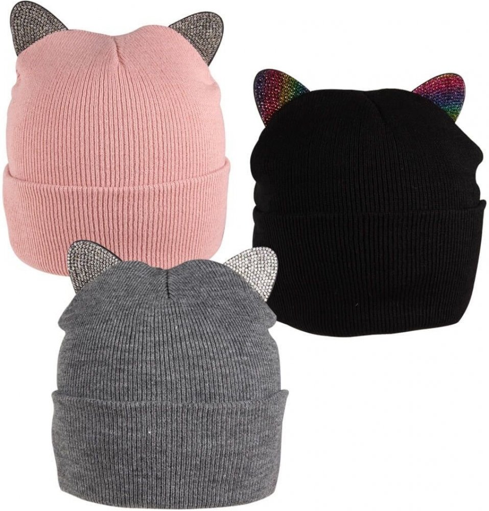 Pletená dámská kočičí čepice s ouškama vykládanýma třpytivými kamínky, ve čtyřech barevných provedení. Buďte pěkně v teploučku!