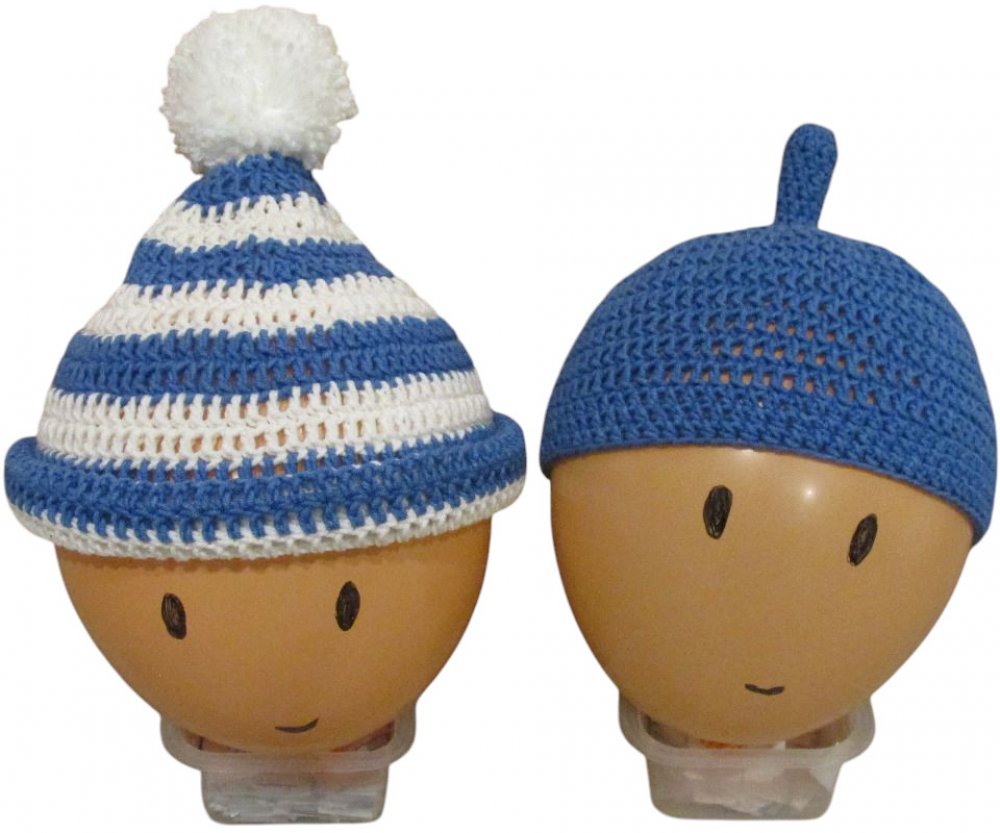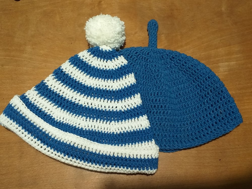 Háčkované čepice Pat a Mat vel. 48-50 cmVhodné na maškarní karneval, masopusty, dětské dny, Haloweeny atd... Háčkováno ze směsové příze bavlna/akryl.Velikost 48-50 cm - vhodné pro děti 1,5 - 3 roky.Prát lze v pračce na 30°CCena je za obě čepice