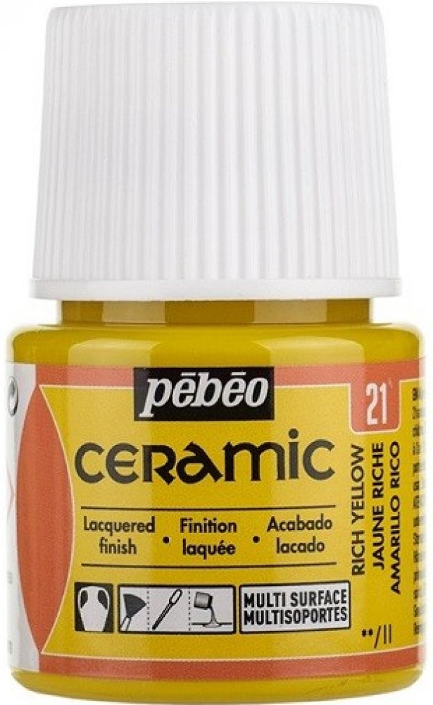 Rozpouštědlem ředitelná barva PEBEO Ceramic je zárukou originálního výsledku! Neprůhledná a velmi lesklá barva je ideální pro dekorování keramiky, porcelánu, kovu, skla, dřeva, plastu a plátna. Celá řada jedinečných lesklých barev obsahuje 28 odstínů v 45 ml lahvičkách. Vytvářejí strukturu imitující glazuru nebo lesklého smaltovaného vzhledu. Všechny odstíny lze vzájemně míchat a kombinovat s jinými PEBEO barvami (např. s barvami Fantasy Prisme, Fantasy Moon, Vitrail na sklo). Použití: Před použitím barvu důkladně promíchejte. Barvu můžete aplikovat štětcem, pipetou, houbičkou nebo přímo z lahvičky v tenkých nebo silných vrstvách tak, abyste vytvořili prostě úžasné barevné kombinace. Dekorovaný předmět musí být odmaštěný a důkladně vyčištěn. Po uschnutí vytvářejí extrémně pevný a pružný ochranný film, který je neprůhledný a hladký. Usychá na dotek po 2 hodinách, ale k úplnému uschnutí dochází až po 10 hodinách. Doba sušení se může lišit v závislosti na tloušťce nanášené vrstvy, teploty a vlhkosti místnosti, kde se dekorovaný předmět suší. Na ředění a čištění nářadí se používá minerální líh. Po zaschnutí jsou odolné vůči šetrnému omývání a poškrábání. PARAMETRY PRODUKTU: rozpouštědlem ředitelná barva na keramiku, porcelán, sklo, kov a pod. výborné krycí vlastnosti, odolná vůči světlu vytváří pevný a pružný ochranný film po uschnutí objem: 45 ml hořlavý produkt - uchovávejte mimo dosah dětí
