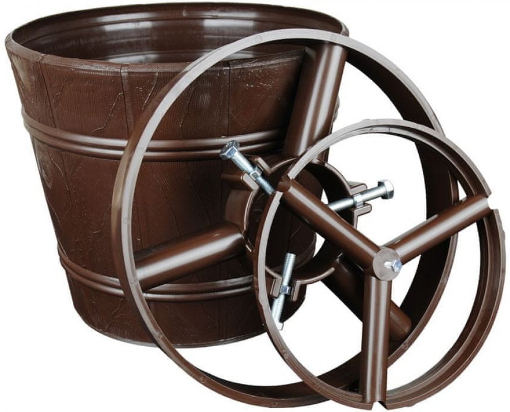 Plastový stojan na vánoční stromek v podobě vědra.