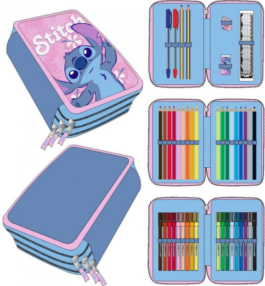 Modrý třípatrový penál s motivem Stitche je ideální volbou pro všechny malé superhrdiny. Obsahuje kompletní školní vybavení – 18 pastelek, 18 fixů, červenou a modrou propisku, tužku, ořezávátko, pravítko, nůžky a gumu. Praktický a přehledný design zajistí, že všechny pomůcky budou vždy po ruce.