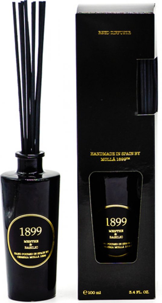 Cereria Mollá Aroma difuzér Menthe & Basilic je elegantní černé barvy s detaily v zlaté barvě. Difuzér je vyroben ze skla a má hmotnost 0,32 kg. Tento difuzér je skvělým doplňkem do vašeho interiéru a jeho vůně má osvěžující a relaxační účinek díky kombinaci máty a bazalky. Ideální pro vytvoření příjemné atmosféry doma či v kanceláři.